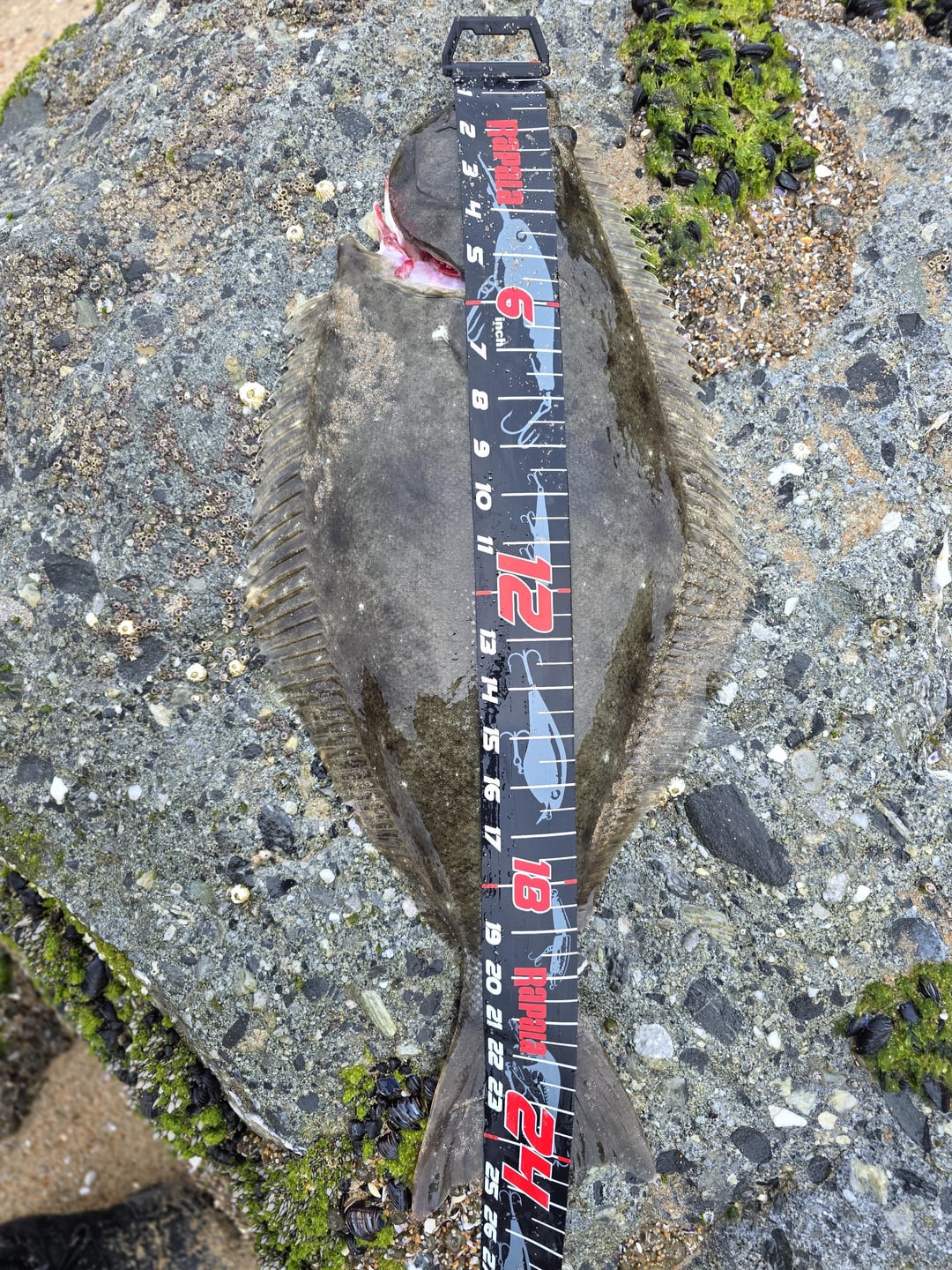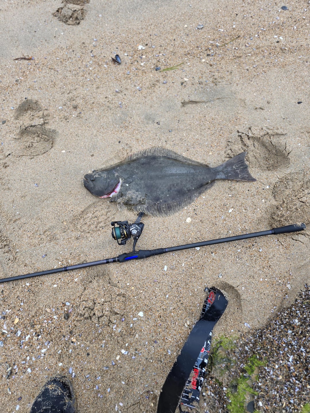 Went out early this morning with the goal of catching a legal halibut. Came up with 2 legal after 40 minutes of fishing. Im using the 11 ft okuma rockaway sp, 20lb braid to 20 lb fluoro, and a white superglow LC. Im only showing one of the fish. I took a photo of the other fish with some identifying landmarks. Go find your own hole…😅
