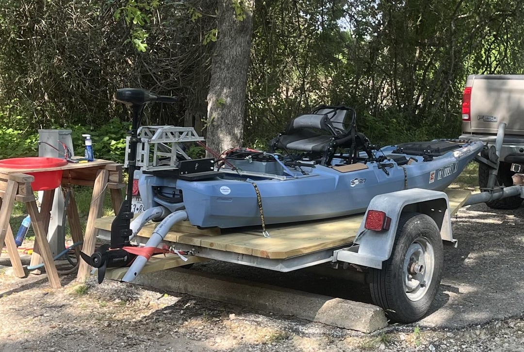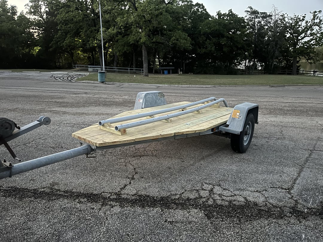 2” schedule 40 electrical PVC bunks shaped to contact the hull continuously (this took a lot of time hole-sawing the 4×4’s at the right angle and spacing), 2×8 mounted under cross members supports the trolling motor weight so the hull doesn’t flex while transporting, wood deck allows me to load and unload without stepping in the water, the extra weight of the wood has also reduced the amount of bounce, the trailer was free (my Grandpa bought it in 1974), I spent $400 to install the deck, bunks, safety chains, D-rings, hitch and tongue locks, and new lights and wiring