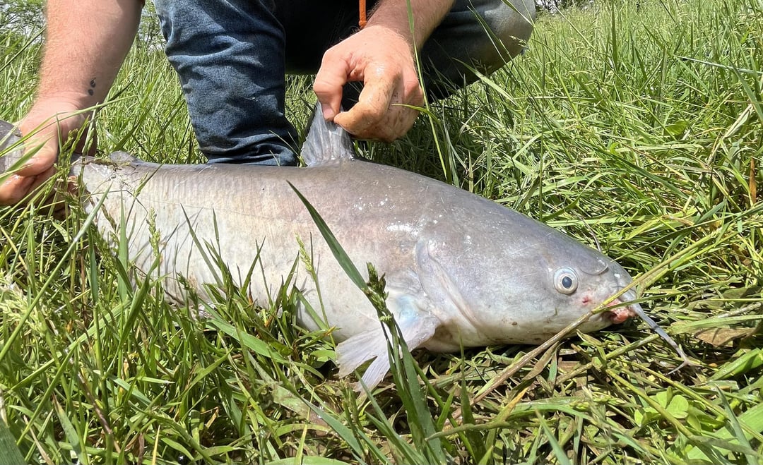Not the greatest pictures. We watched er roll at the surface of the water, 5-6 foot off the bank. I dropped my shad head straight down in that spot and 3 minutes later hooked this feller. Put up a decent fight for a smaller blue!
