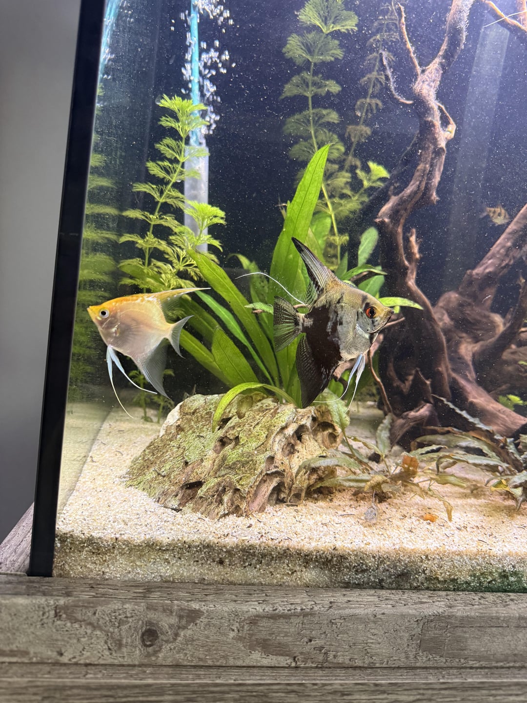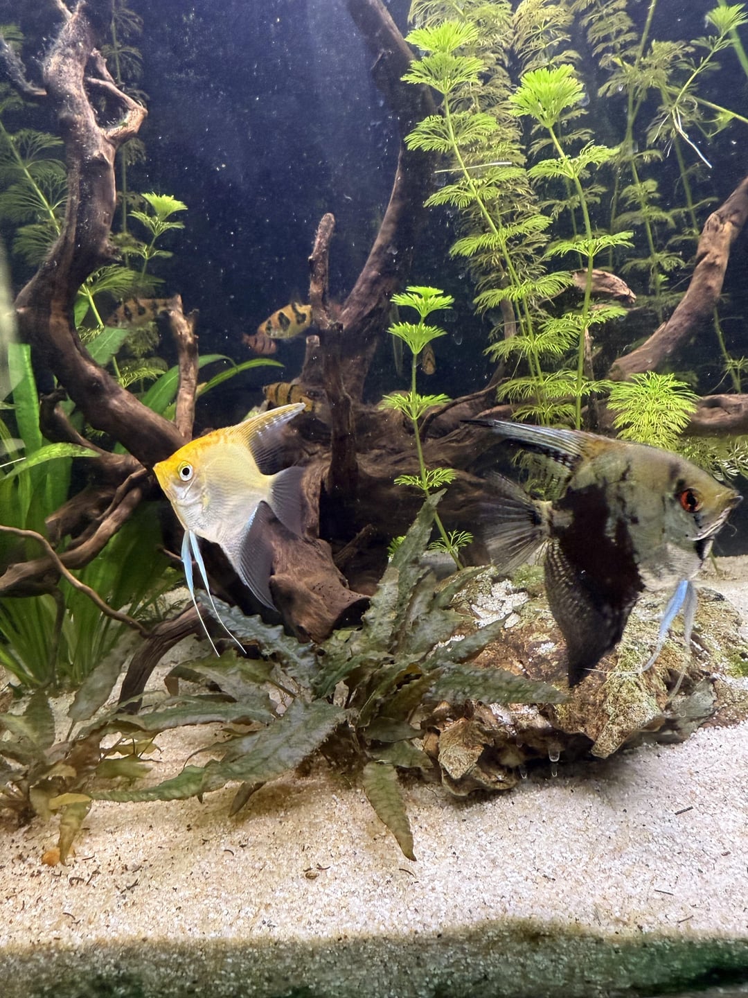 So I’ve had these angels for about 5 months now and I feel like they may be a pair but also might both be female? The black Smokey angel is a lot bigger than the golden but the golden actually seems to quite bully him/her!