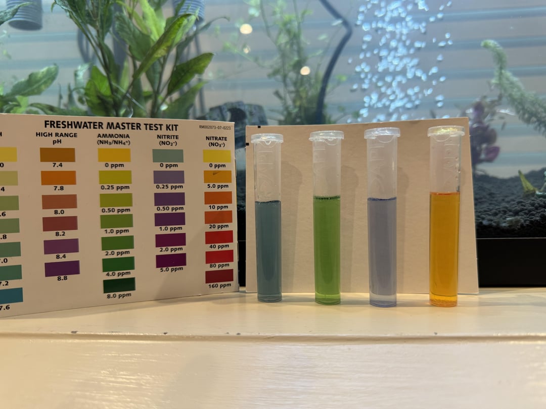 Thanks for everyone’s help! I’m a first time tank owner, trying to make a home for fish! My tank is COOKIN! Her cycle is definitely doing its thing! My mystery snail back there is stressed after changing the substrate, she slimed the fuck outta my tank last night but isn’t sliming this morning. My tanks PH is down where it needs to be finally. Hopefully this stratum won’t make these numbers swing for too long. 2nd pic is my parameters from today. 3rd pic was my tank yesterday, and the 4th pic is how I started 3 weeks ago.