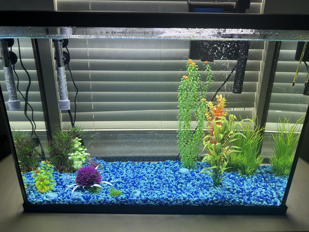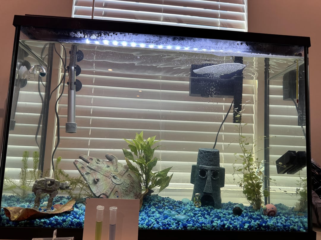 Any tips for that ugly black tube from the bubbler in the back are greatly appreciated. (My daughter says we should bedazzle it so I’m hoping y’all have a better idea.)
