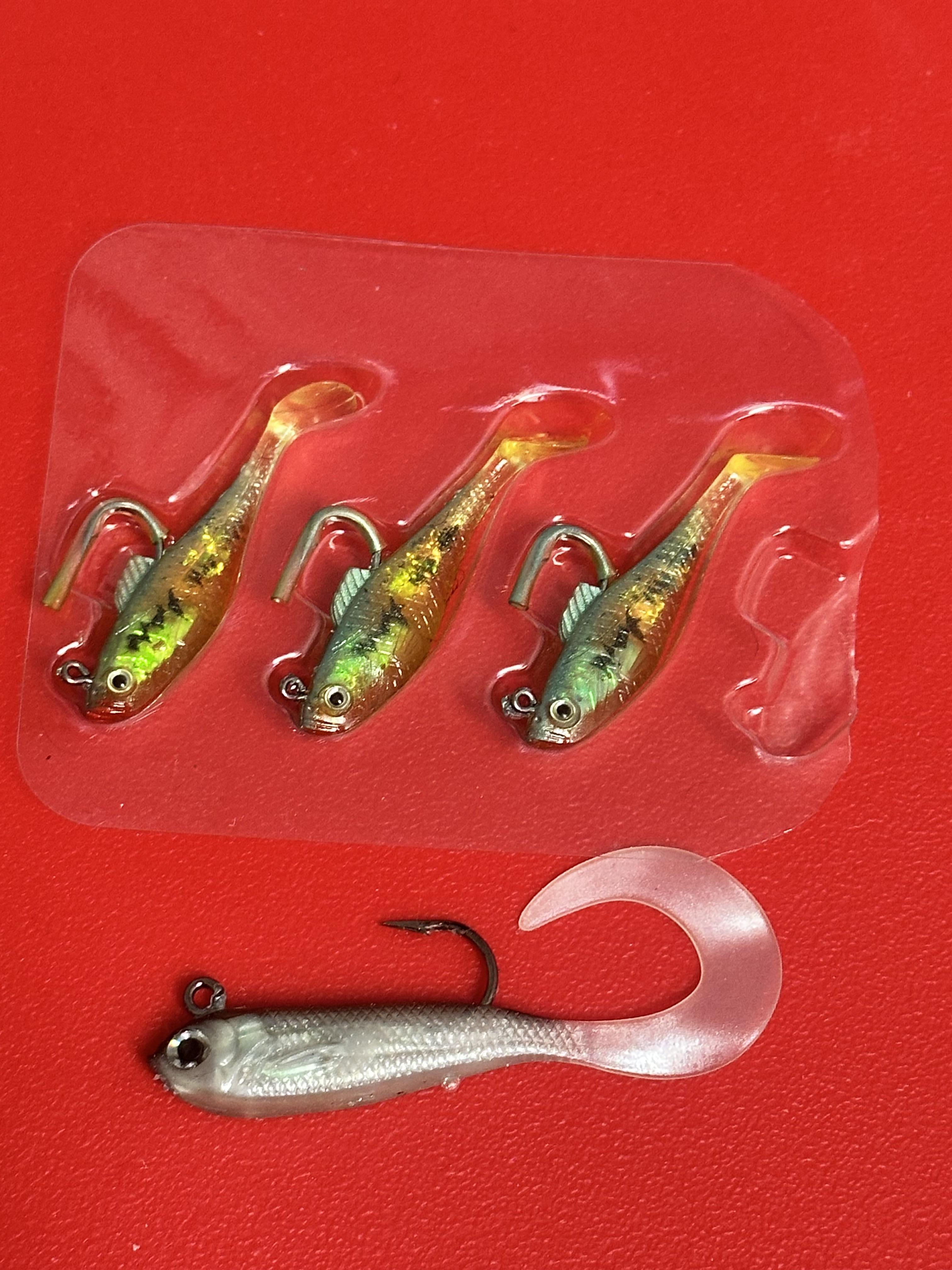 Top one is berkeley swim shad, 1/8oz and the bottom one is curl tail minnow, 1/8oz.