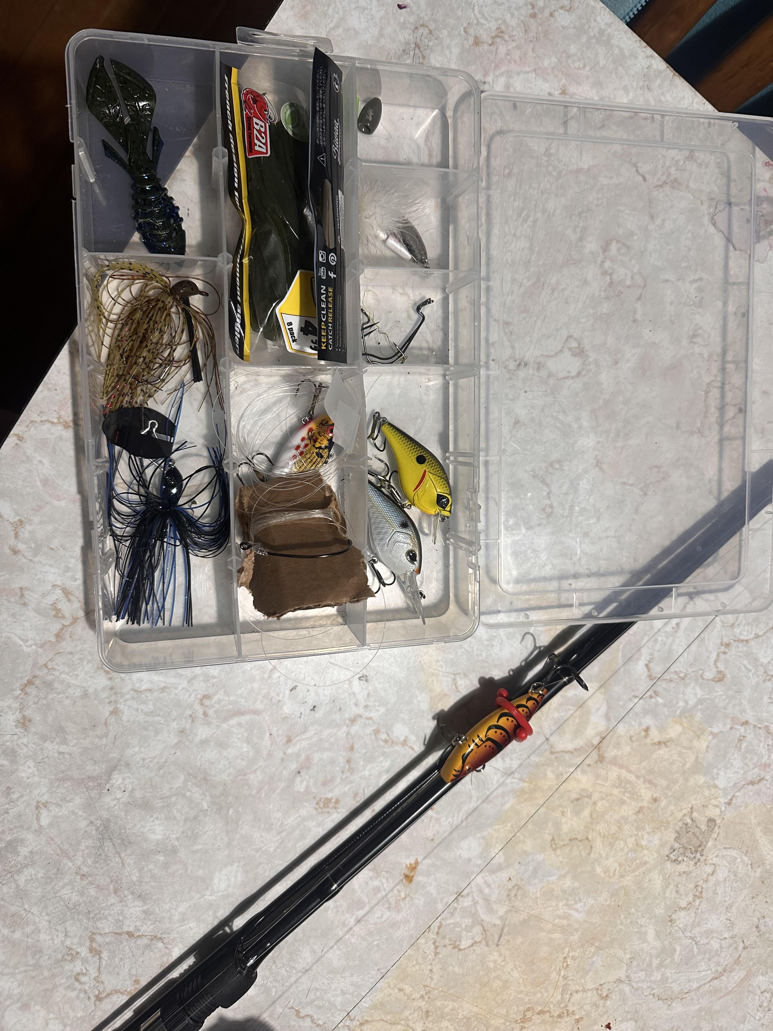 I packed two small runs of fluro carbon to make leaders, I packed a small pliers, a drop shot rig, and some weights to run a Texas rig.