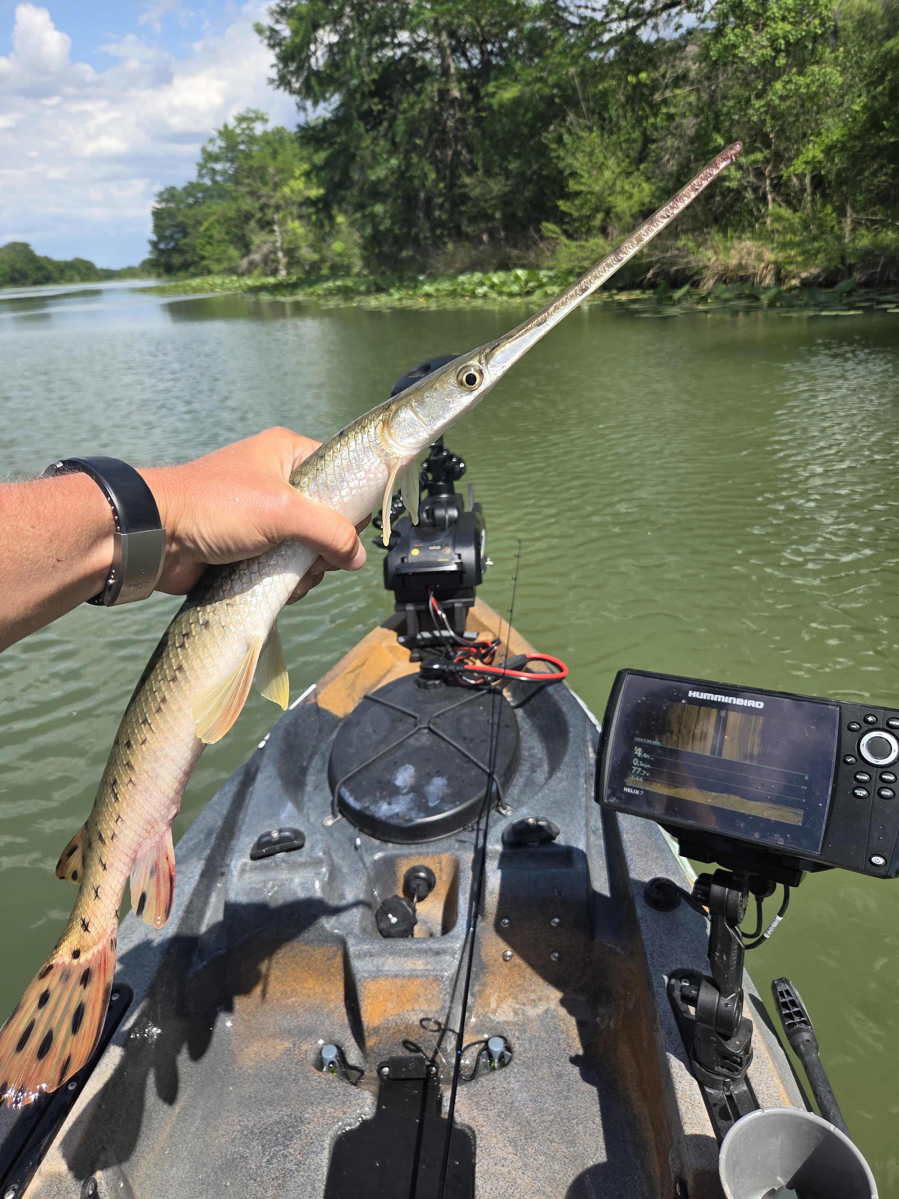 Slow day for bass fishing. Spotted a ton a longnose gar and downsized to a crappie jig. Takes some finesse to hook one but was able to get one of the smaller boys. Lots of bites; only 1 got the hook. Thinking of getting rope flies as a backup when bass arent active.