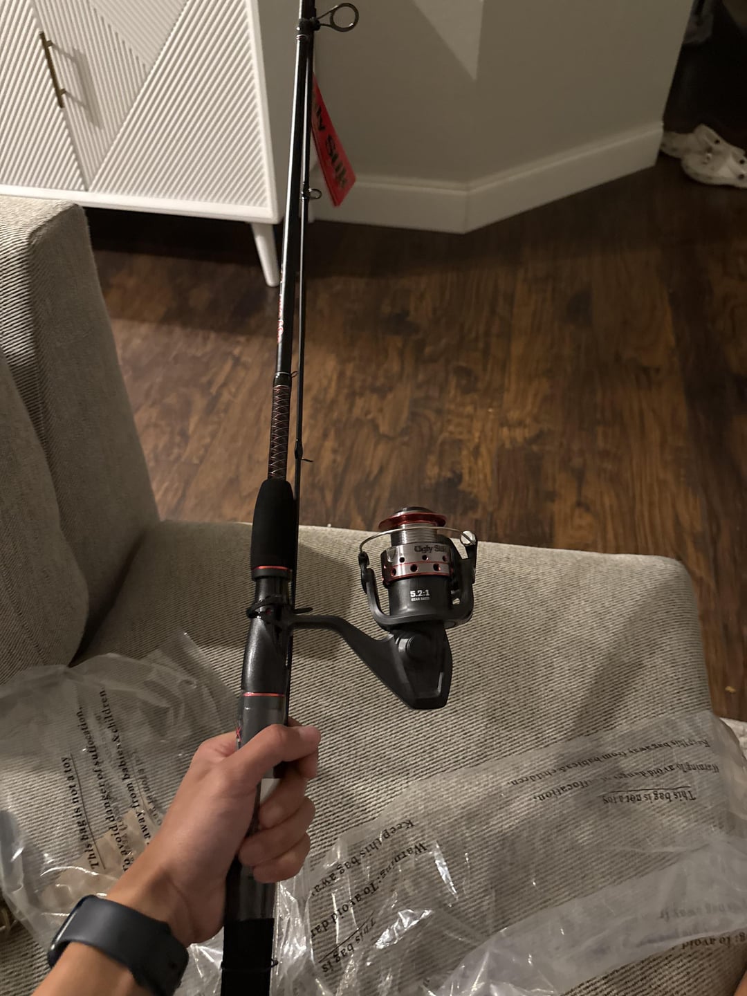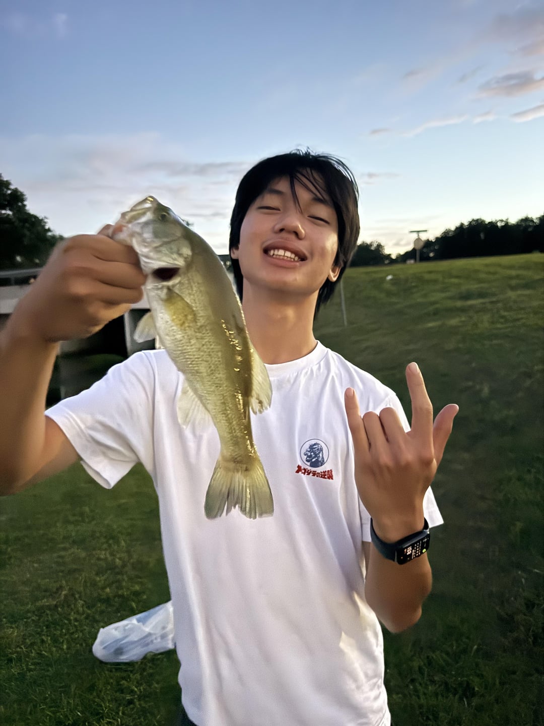 Never been fishing went out today with my boy for the first time and caught this bass.