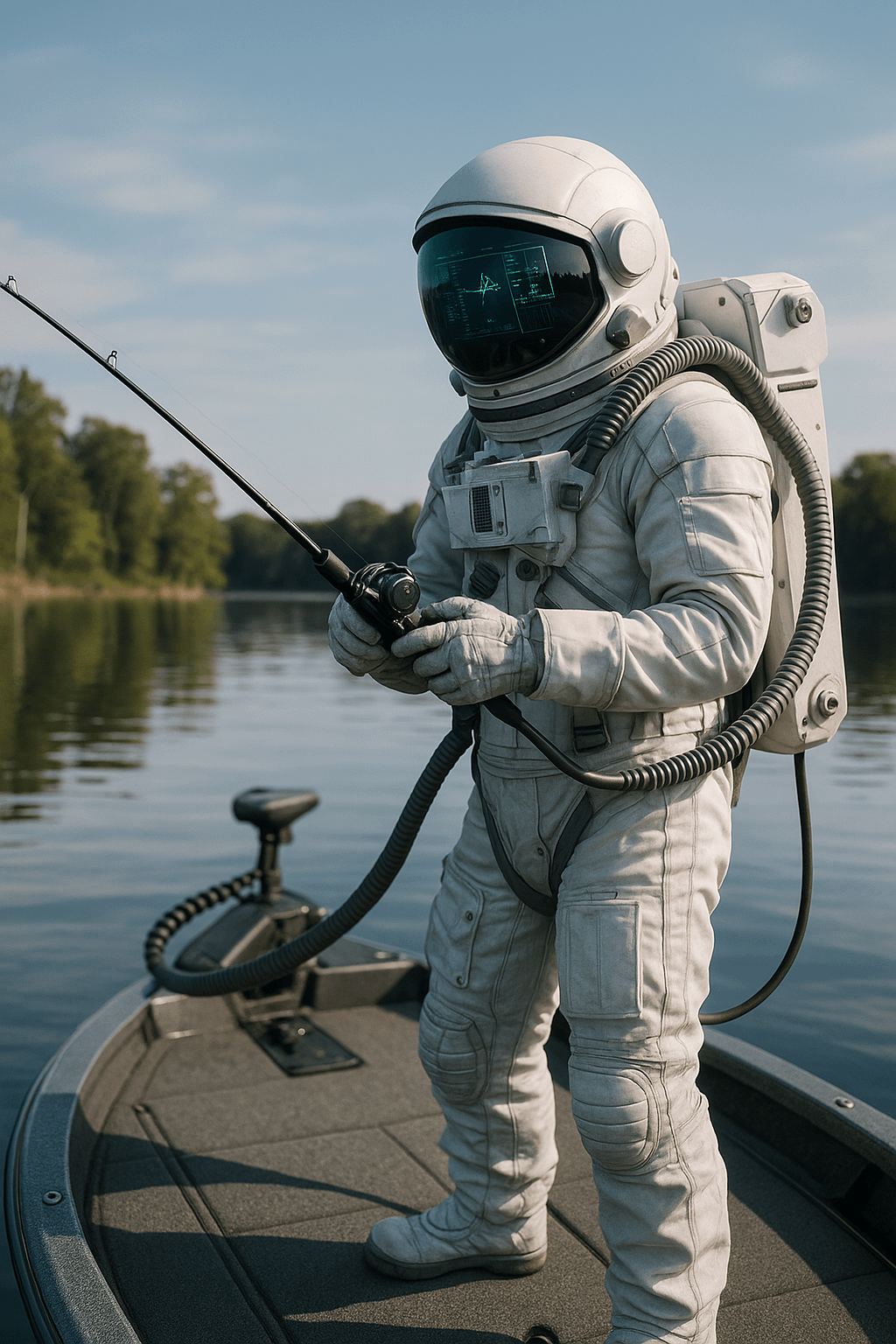 Hear me out. A full body suit for bass fishing that is hard wired climate controlled, 100% UV proof, 100% bug proof, displays all your live scope imagery on the interior of the visor like a fighter pilot, wifi internet connected with ChatGPT…welcome to the Basstronaut.
