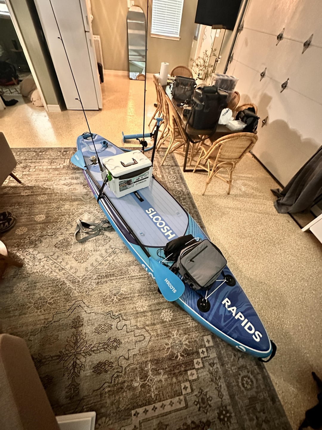 Not quite a kayak but kinda of converted it into one. Last thing I want to get is a motor and since it has threaded inserts in the front rings, I’m developing a plate to mount a fish finder to. Box is a Magellan 30 qt dry/bait box that has the ability to connect an aerator to or stores 4-5 3700 boxes well. Just used 1.5 inch hook and loop to secure around the board and it doesn’t move. Easily supports my weight sitting