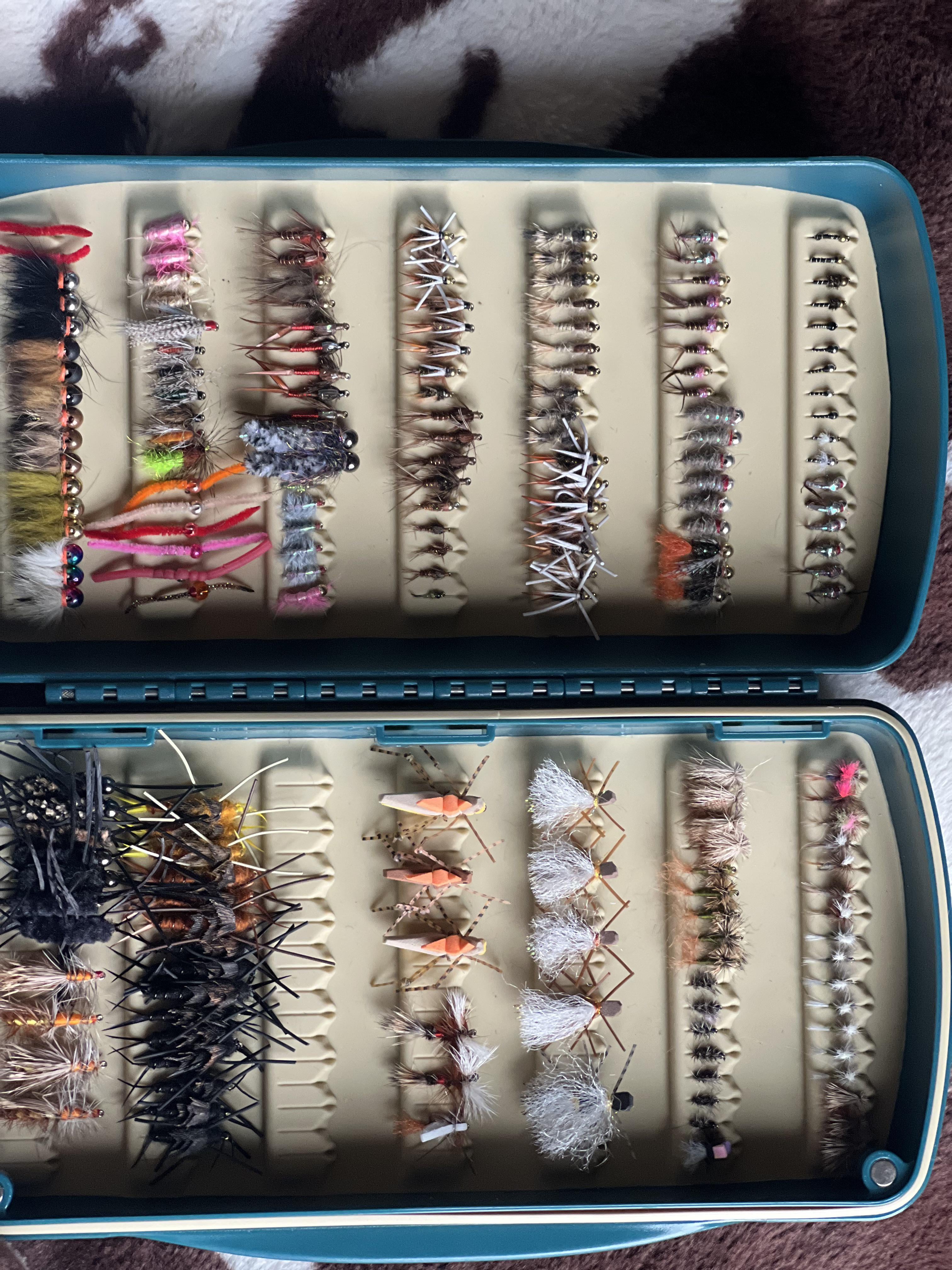 Pretty good. You need some mayflies in both dun and spinner patterns in olive, rust, and pale yellow, three sizes of each. So that’s 36 more flies. Edit: looks like you may have a few olives and maybe some iso patterns. Those are good.