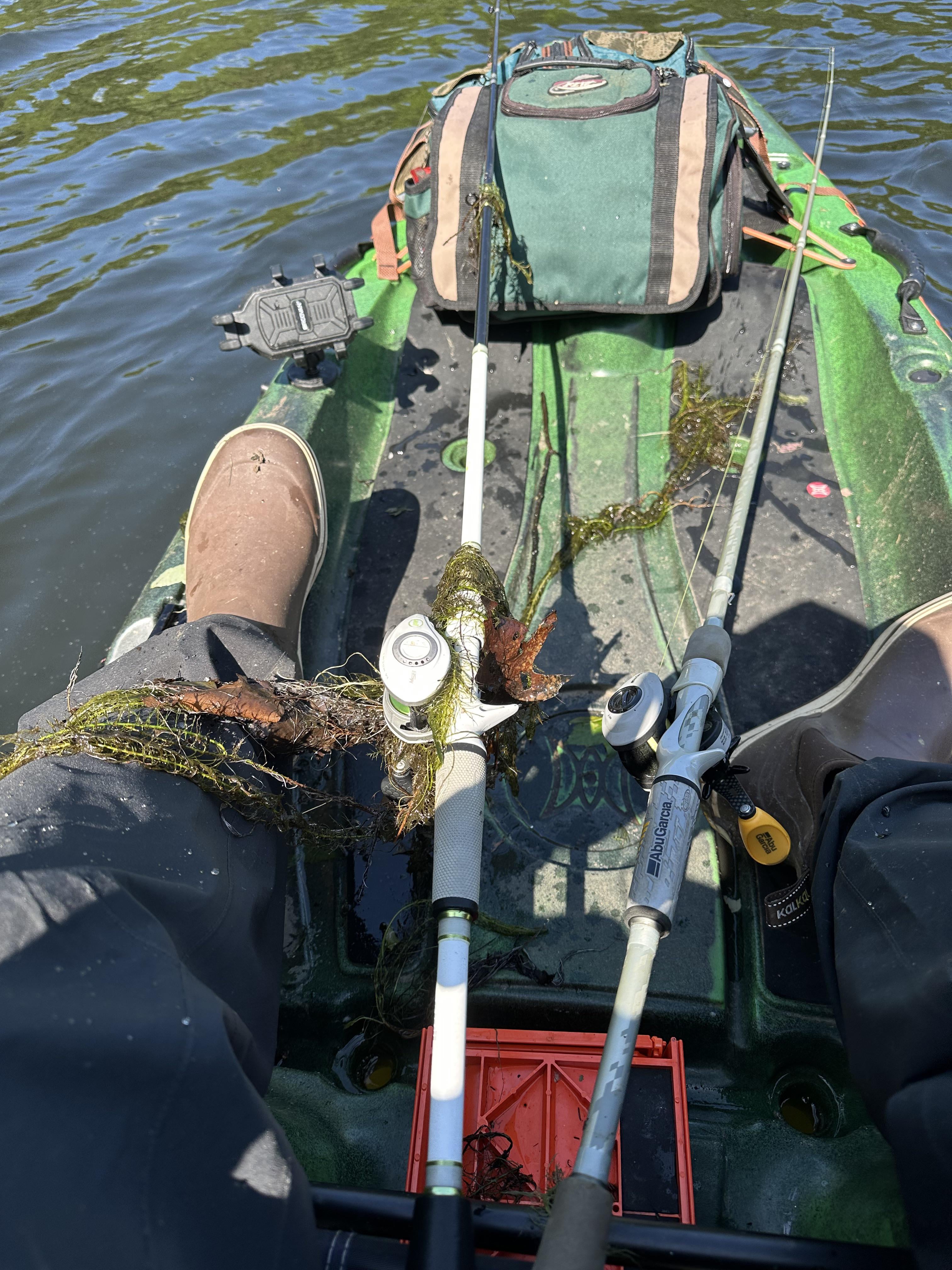 I’m slowly dragging the spoon across the bottom. Ripping it through a couple of weeds and then I feel a little “tink”. I’ve felt this before with the lone branches I’ve found. There no way I thought. I keep reeling, keeping tension on what I’m almost certain is a branch. My kayak drifting closer to my “catch” because of the weight. And just a few feet from my kayak, my favorite combo rises from the water. Literally in shock at what I’m looking at. There is no way. On my (actual) last cast. I get my big catch in the boat and just stare at it in disbelief. Weeds and muck hanging off it in all her glory. I dunk the combo back in the water to wash her off, thinking- a little more water can’t hurt. Bare and without any line, shining like she never shined before, I put the rod back in the holder and I’ve never been happier to paddle back to launch.