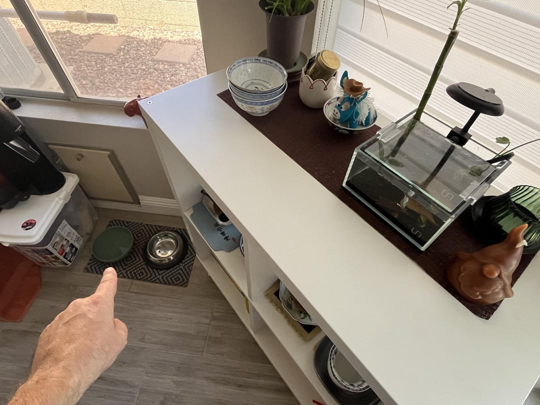 Somehow, despite a lid covering like 90% of the tank, the fish presumably jumped out and by some miracle landed in the dog’s water dish roughly 4-5 feet away. Or it was on the floor and the dog put it in the dish without harming it. We have no idea since nobody saw it.