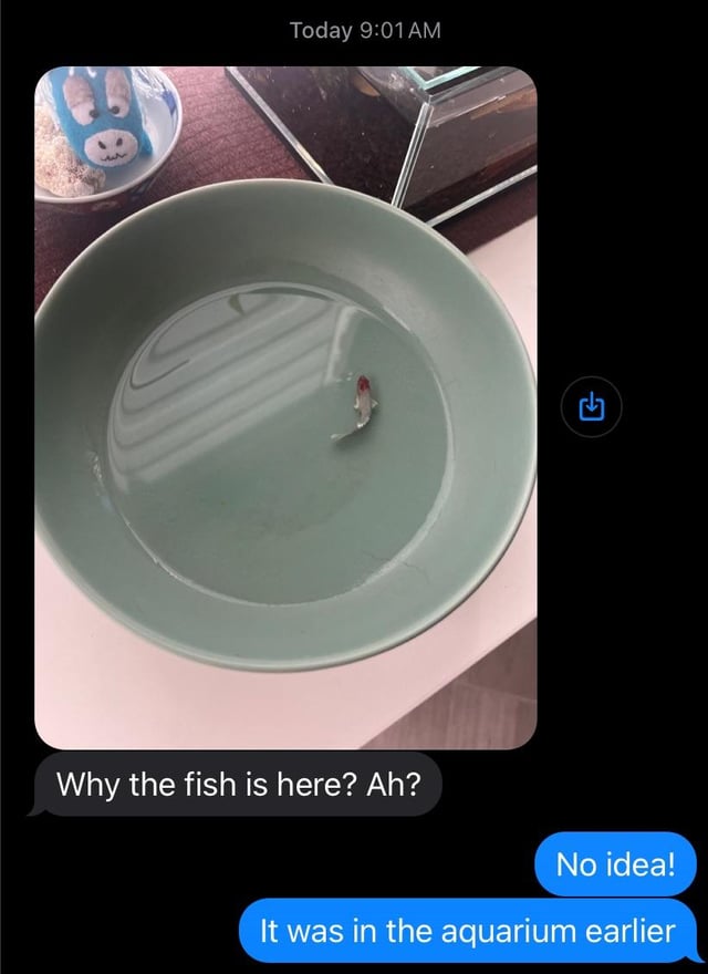 Anyway… I fed the fish this morning around 7:00am, left for an appointment at 8:45am, and get a text from my girlfriend around 9am asking why the fish is in the dog’s water bowl. I’m like… “excuse me?”
