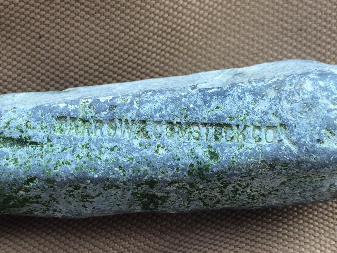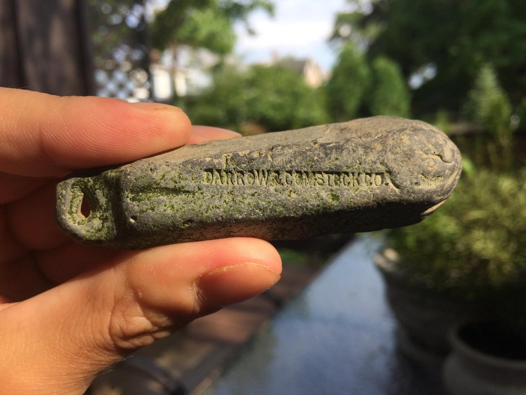 While metal detecting a brook I found this 10 oz. fishing weight. It’s stamped “Dorrow & Comstock Co”. They were a Ship Chandler company in New London CT from the late 19th to early 20th centuries.