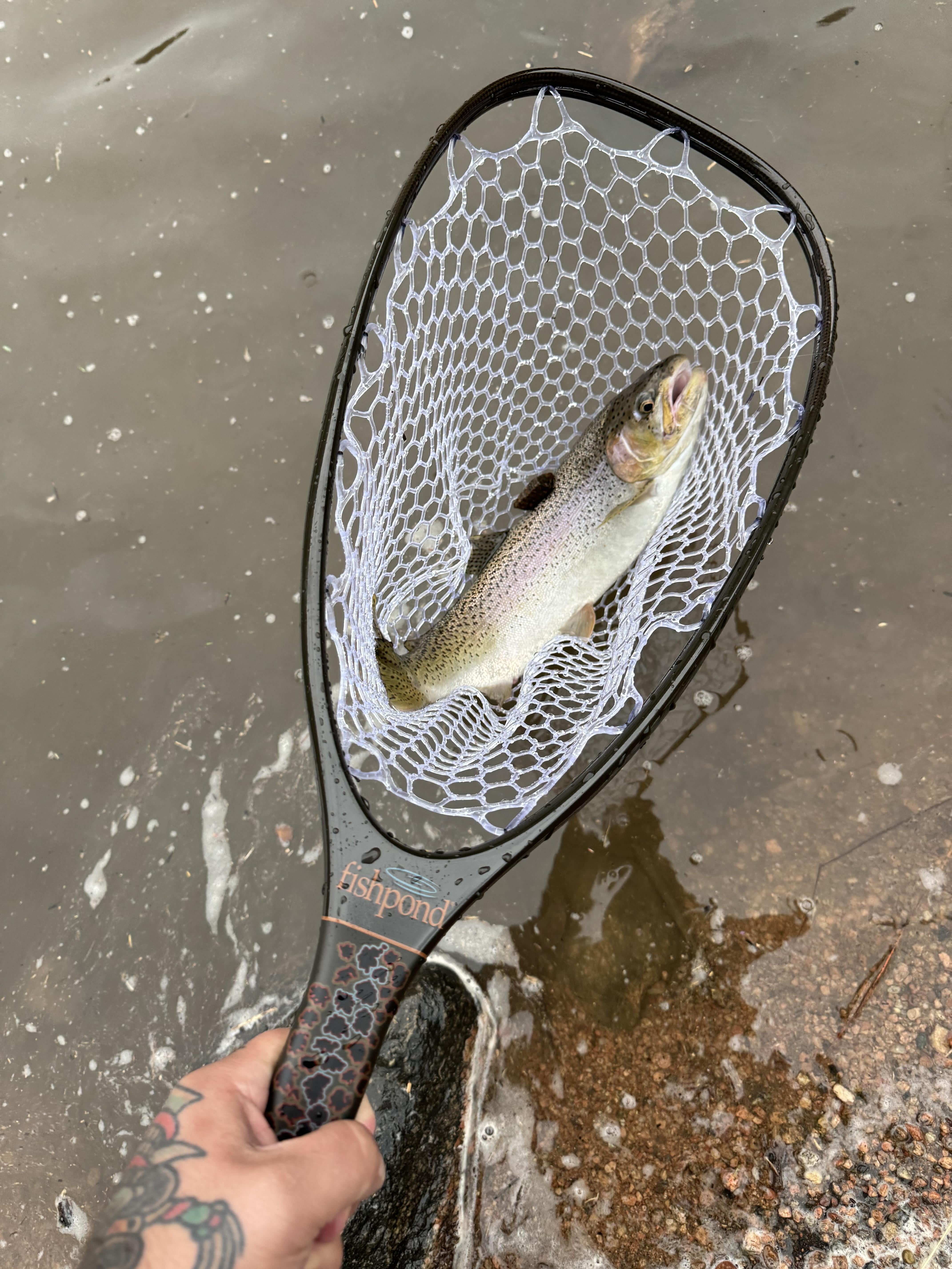 Landed my PB; Beautiful buck rainbow. Released healthy. Rocky, weedy, snaggy creek and 6lb test made for a hell of a rodeo… Not sure what he weighed but the measurement from the crease of my curled hand to the top of my tattoo is 12”. Northern Ca.