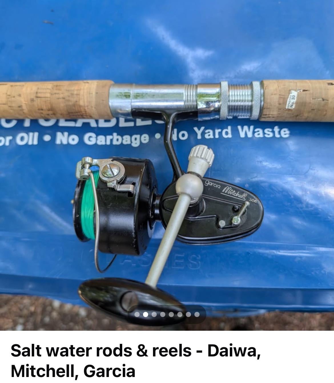 Garcia Mitchell 306 reel (made in France) and Garcia Four Star 10 foot saltwater rod (USA). Medium Action, Fast Taper, 1 to 4-1/2 oz. lures, 12-30 pound line. Looks barely used, really nice cork on the handle. This is a really nice set up to fish or if you like vintage gear. $35