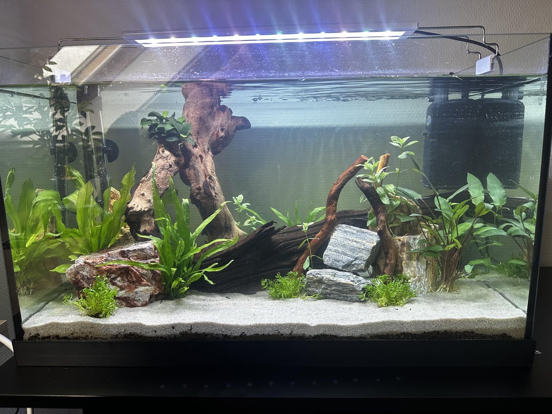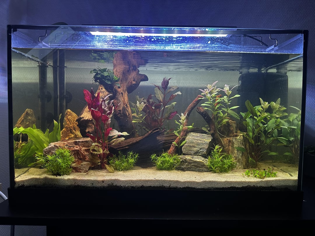 Just added nerite snails today! It’s hopefully done cycling soon so i can add some shrimp and eventually fishies. I changed the scaping a little bit in the middle, wanted some color so added some red plants.