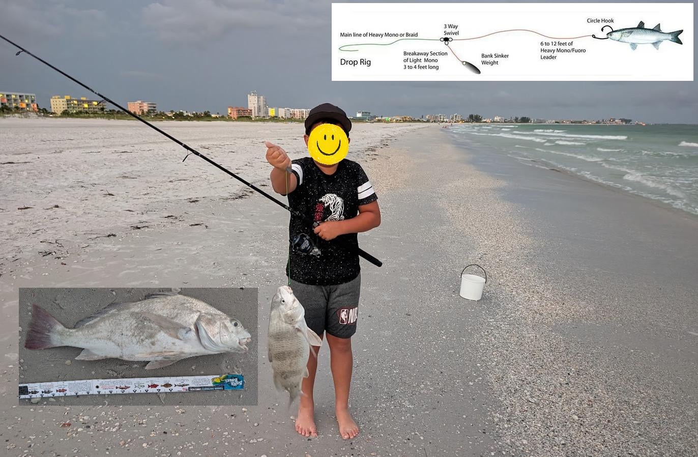 Mostly catching catfish surf fishing on the west coast side of Florida. This is the first non-catfish type on our second time surf fishing. The waves were slightly bigger due to a thunderstorm. This was caught maybe about 10 feet from the shore and a few minutes before sunset. We used a drop rig and frozen shrimp. People normally swim on this spot, but since there was a thunderstorm earlier, there was hardly anyone on the beach.