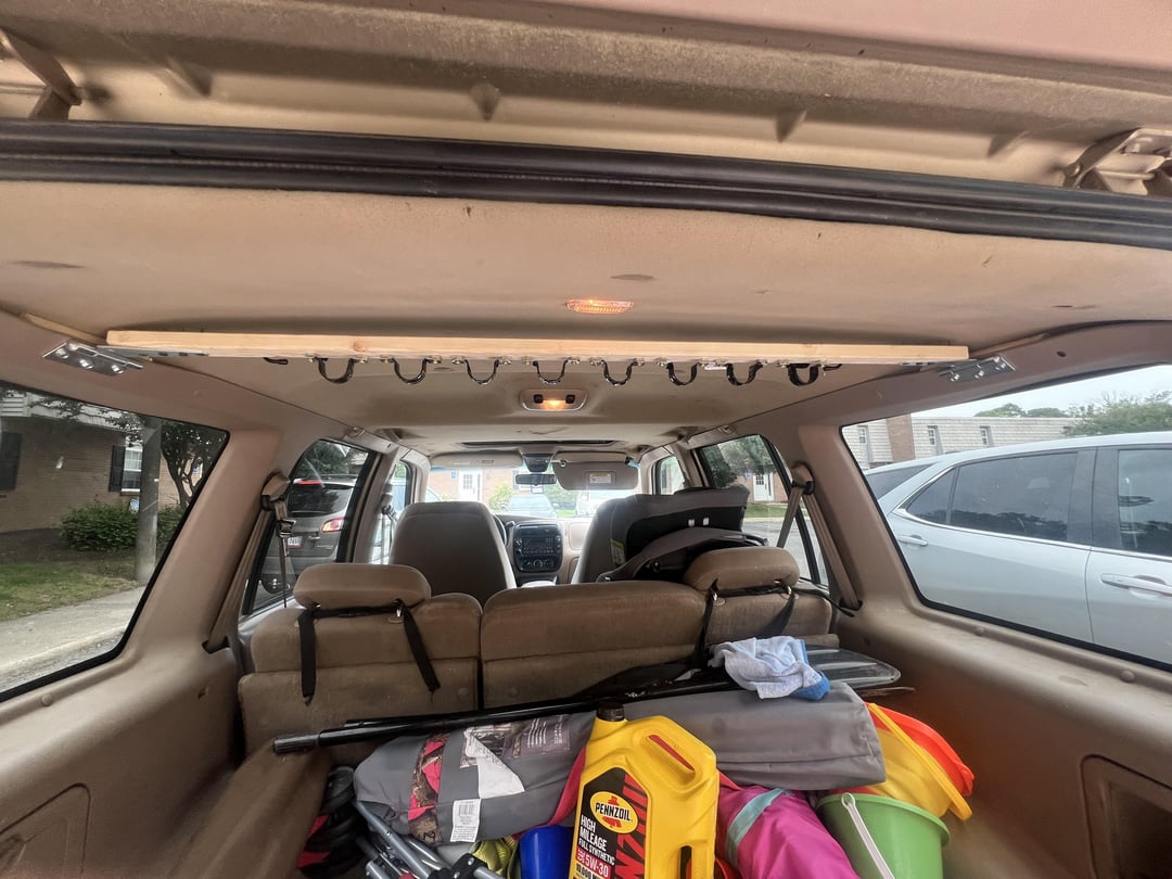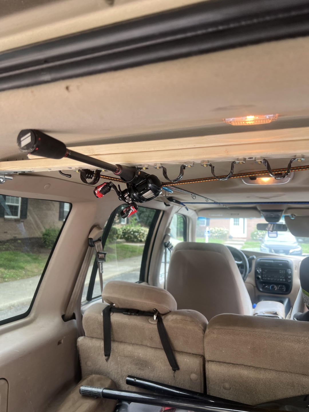 I put this in my 00' explorer came out real nice. I can fit up to 8 rods, which is more than i usually take with me at any given time. I used 4" hinges, a stick of 1×2 wood, and a bunch of 1 1/4 pvc wall mounts. Should work great for what im doing. (Ignore the mess in the back lmaooo)