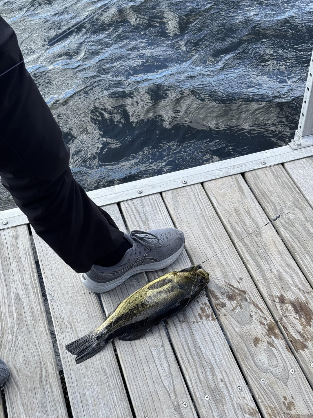 Based on the photos, I can give a rough estimate of the fish’s weight by comparing it to the shoe as a reference. If we assume the shoe is a typical size (about 11 inches / 28 cm in length), the fish appears to be around 17–20 inches (43–51 cm) long.