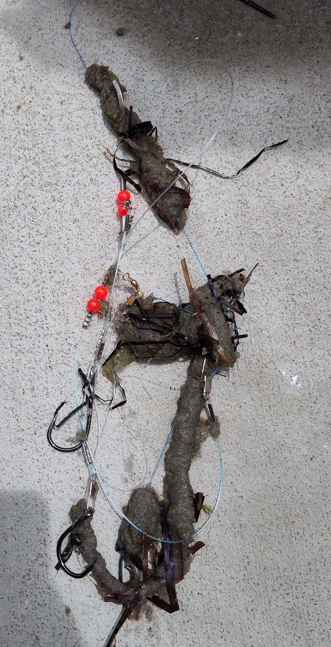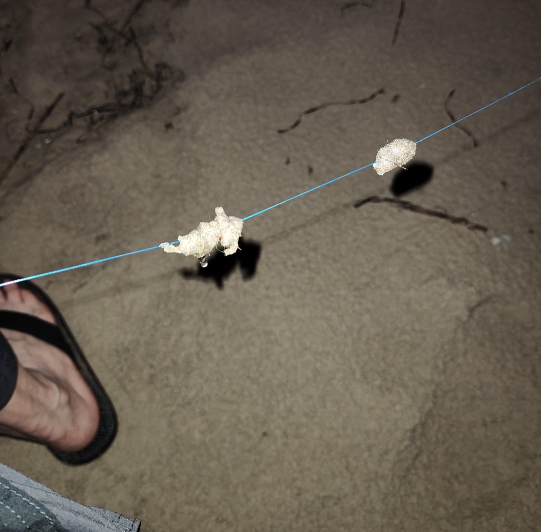 Surffishing in Corolla, NC last week at night. Cast out and as I reeled in I found this nasty green/tan stuff on my line. Almost impossible to get off. Texture like cotton fiber or maybe like the material from a cigarette filter mixed with sand. I let it dry out in the sun the next day. When completely dry, it was easier to pull off. The little balls in my hand were bits that I pulled off with my fishing pliers.
