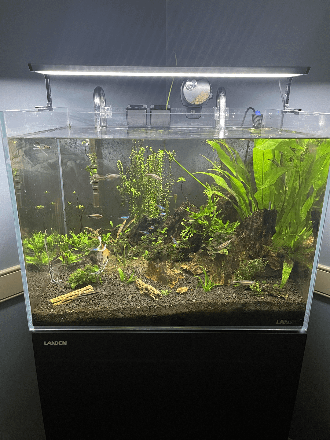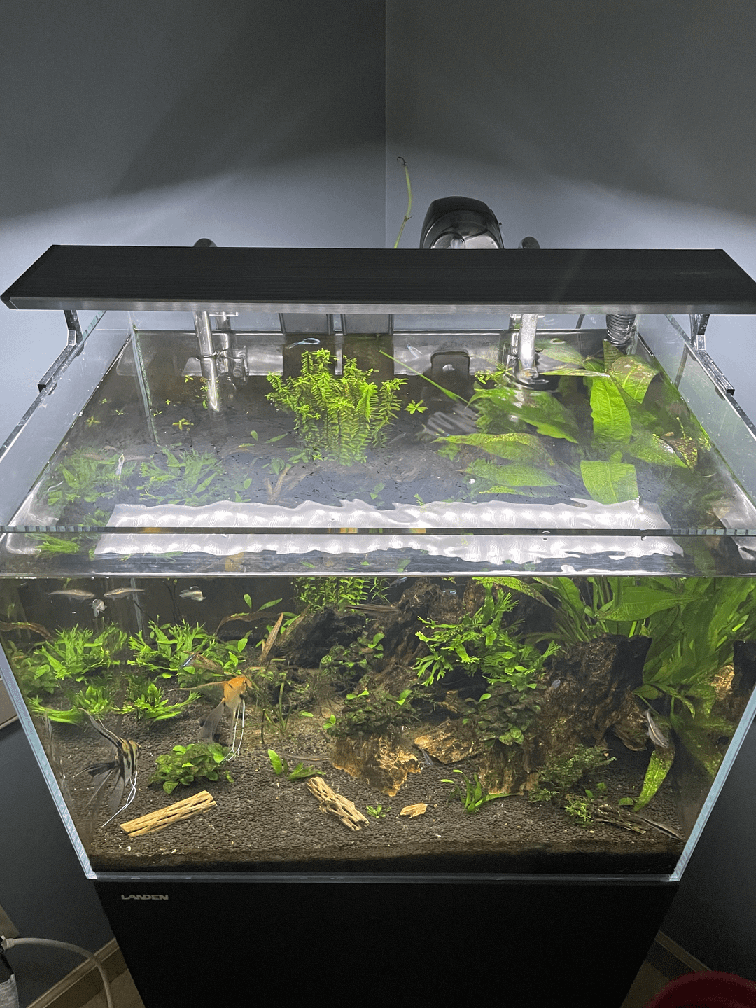I think it looks nice! I like how it looks natural and realistic! Do you have a snail? I like Nerites to help keep the algae off the glass and stuff and they don’t overpopulate the tank as they can’t hatch in fresh water… keep up the good work!