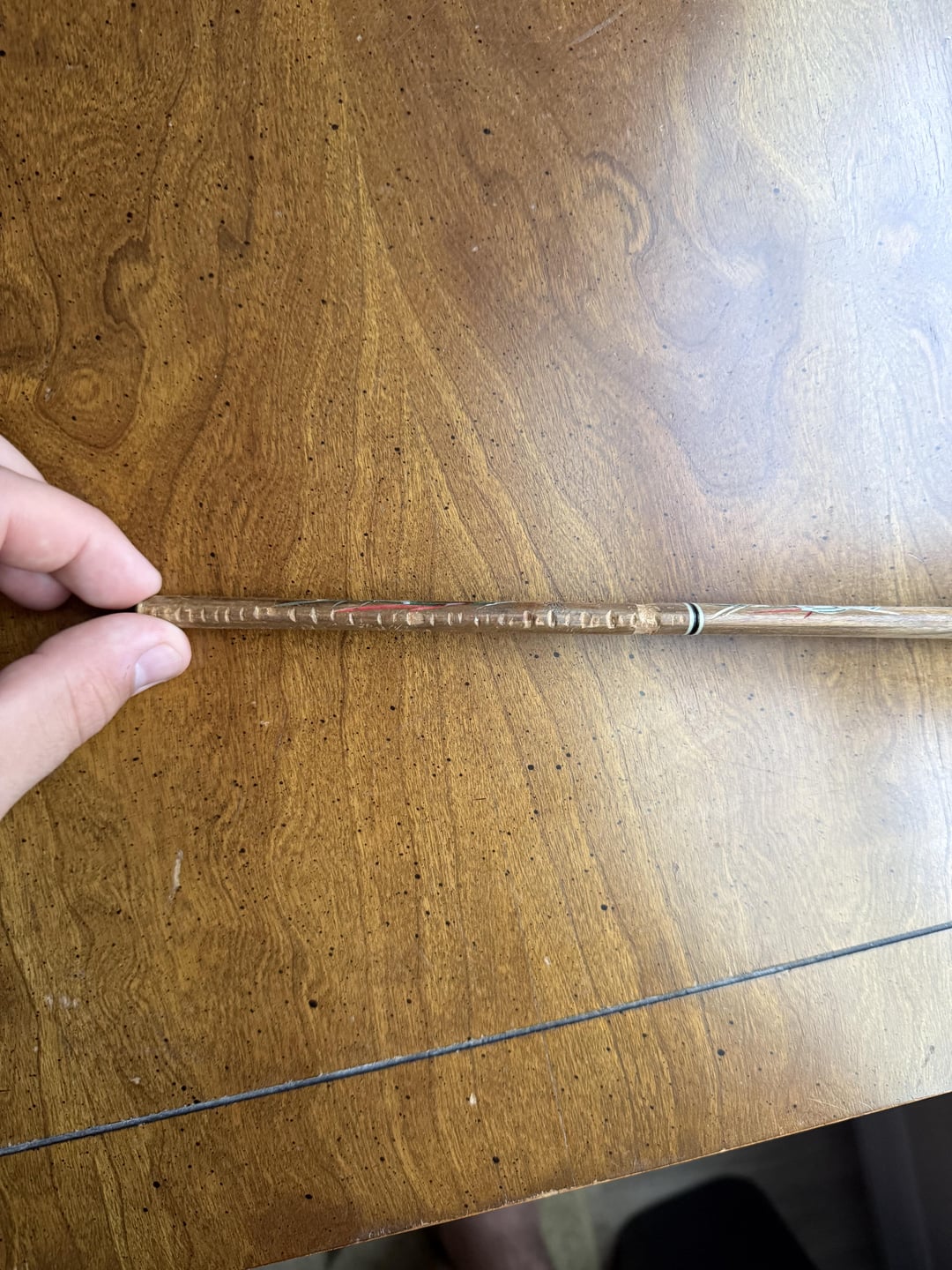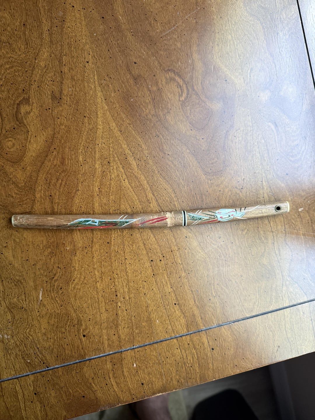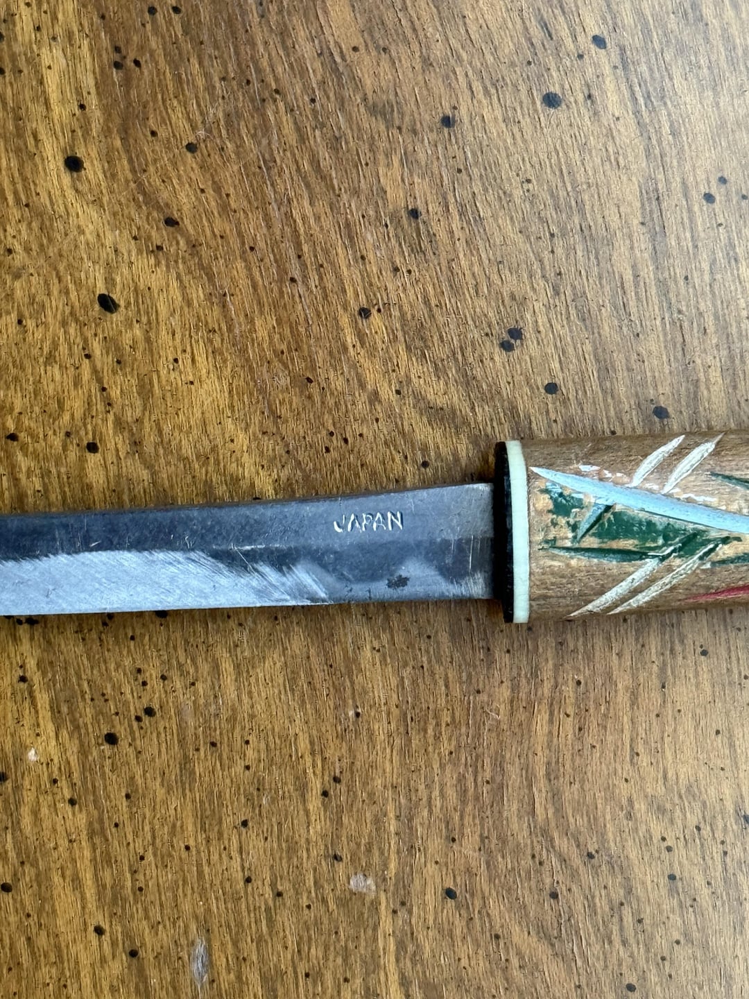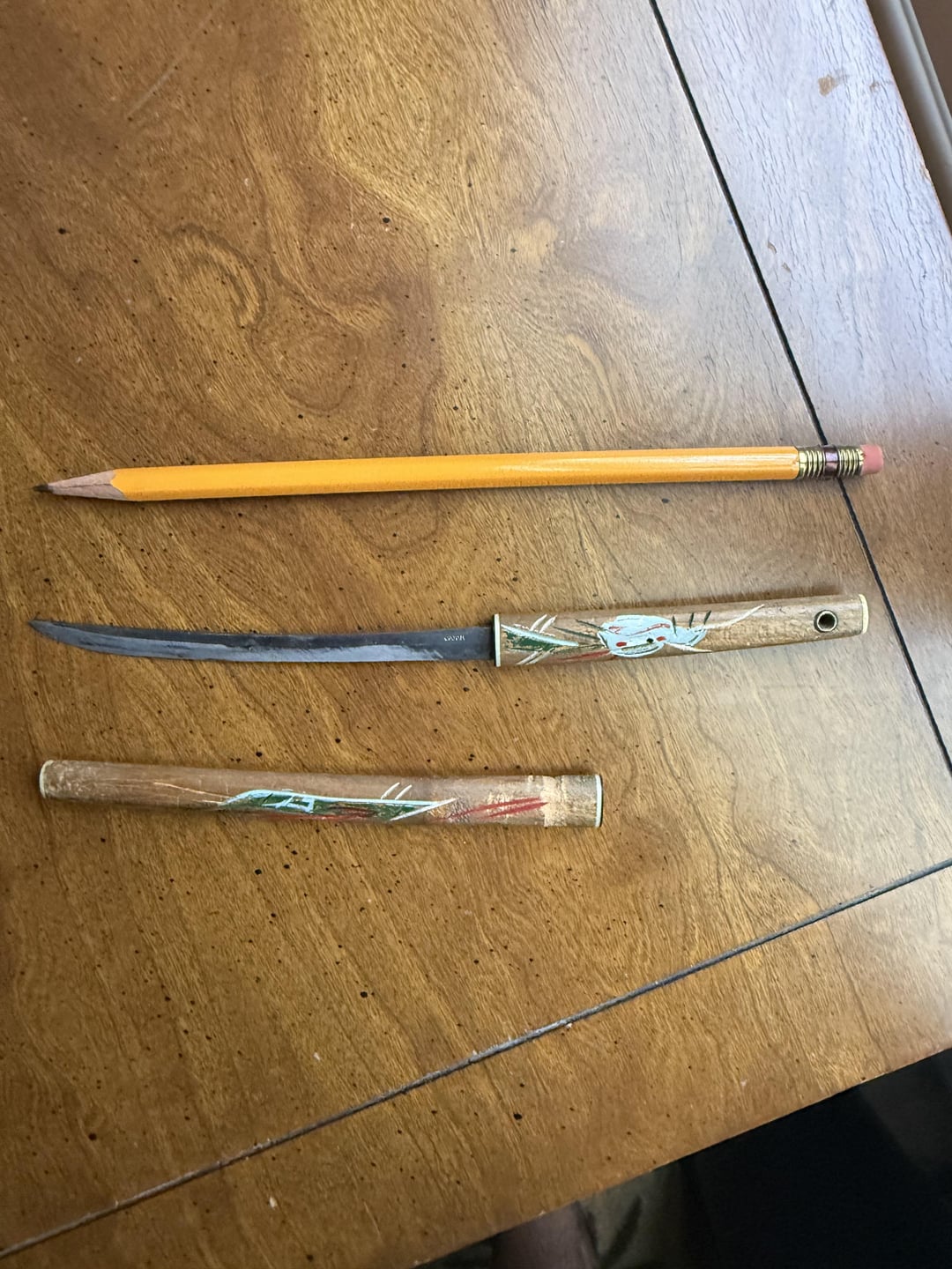 Found this while poking around in some of my late grandfather’s stuff. Posting on this sub because he was an avid outdoorsman and it was kept with his hunting knife. Hand carved/painted with Japan stamped on blade. Carved notches on sheathe. Pencil for scale. Any idea if this is actually used for something or is just a mini katana he picked up while traveling? Thanks in advance!