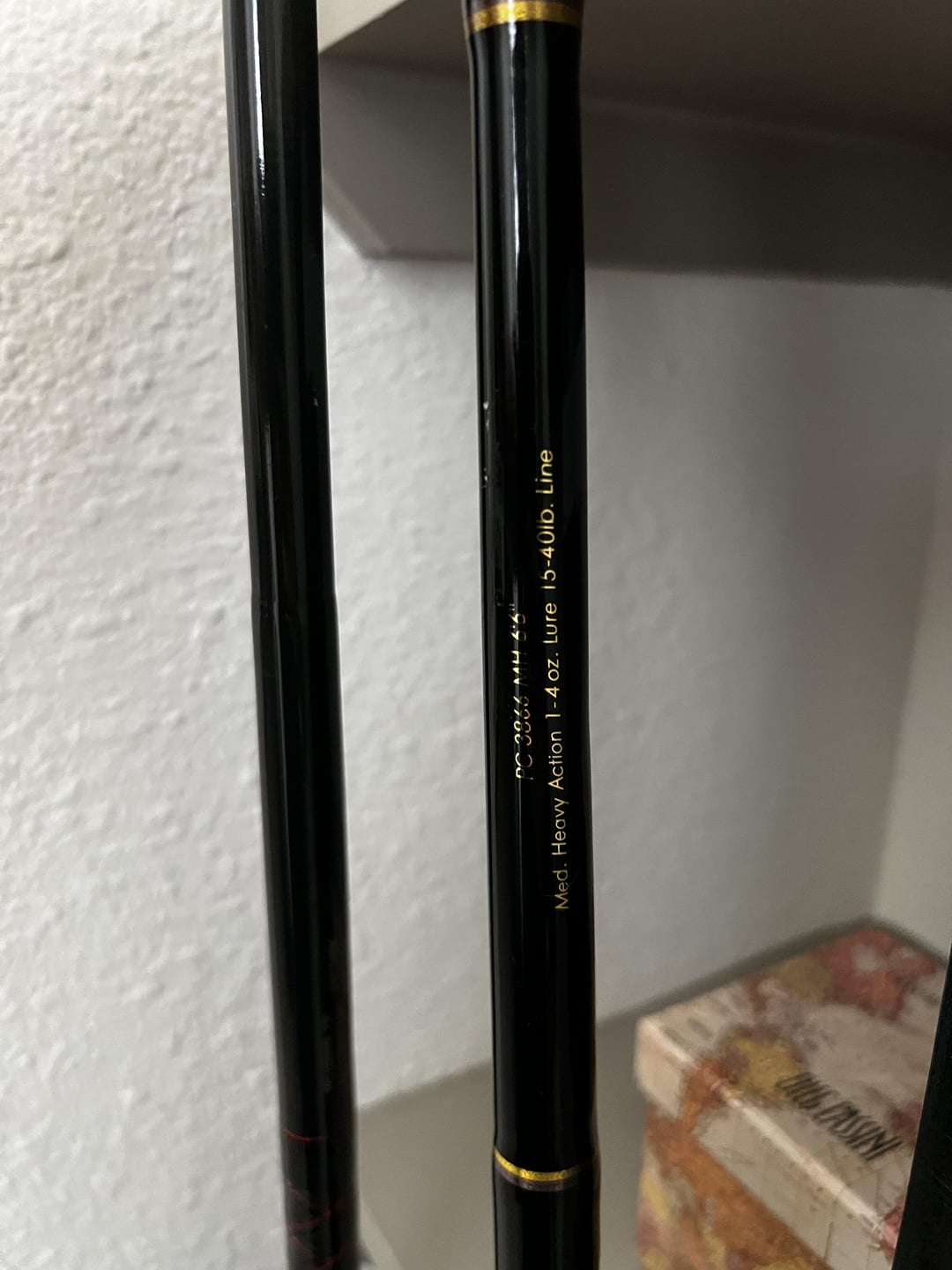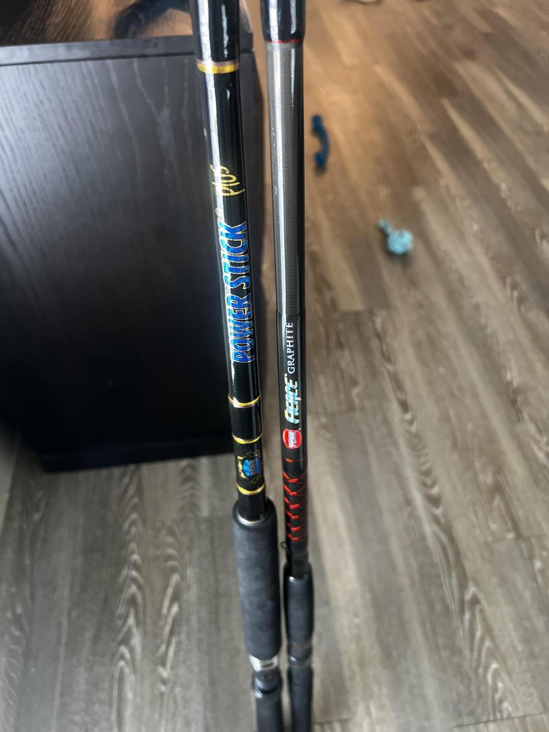 These were leaning next to a trash can the night before trash pickup. From what I can see they are in excellent shape and I would like to try out surf fishing this summer. What reel and line setup should I buy for each of these beautiful looking rods? The black and gold rod takes a conventional fishing reel while the black and red seems to be for a spinning reel. Theres so many reels to choose from I might be getting overwhelmed. Im willing to save some money for a good reel but I would like some ideas that would cover the low, medium, and high tier options I have for these rods. Thank you all!