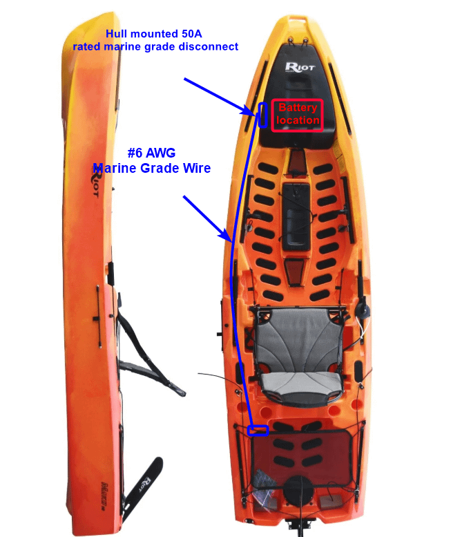 My thought is – install a 50A marine grade disconnect onto the hull at the bow, fish 6ga marine wire through the hull (future proofing if i ever go to a larger motor), with a disconnect at the stern – and cut the spring clamps off the motor leads and replace with the marine 2pole plug.