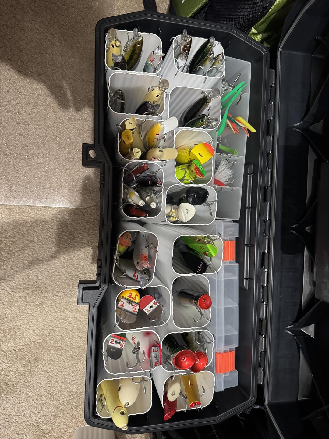 DeWalt 24” One Touch toolbox, 2”x3” plastic downspout, Surf Rite 5 tube insert for tins, random plastic organizer for bucktails Posted by eclwires