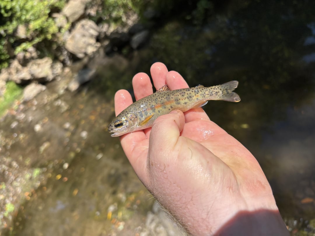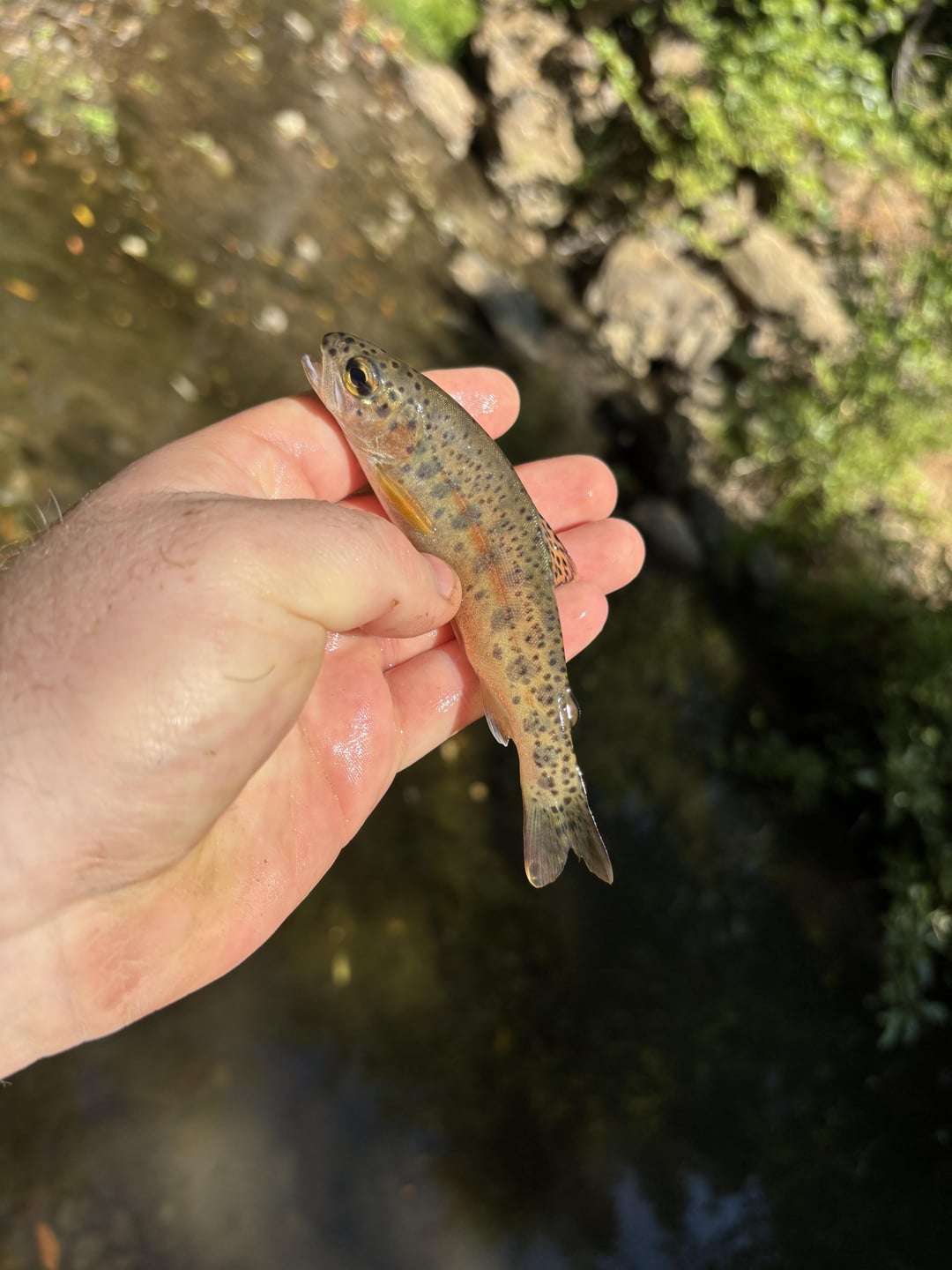 I think it’s a mini rainbow, but friend is saying coastal cutthroat due to black spots on tail and shortness of lateral line. Caught in Marin County, CA south of what would be their standard range.