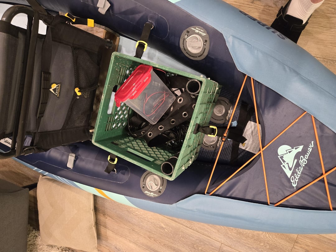 So next steps are fabricating a transducer mount and rod holder. I have 1/2 inch PVC conduit and a heat gun and 3d printer or old aluminum balusters to make what I need but trying to figure out if I should mount it to the milk crate or make something that straps to the side or glue on a Scottie mount.