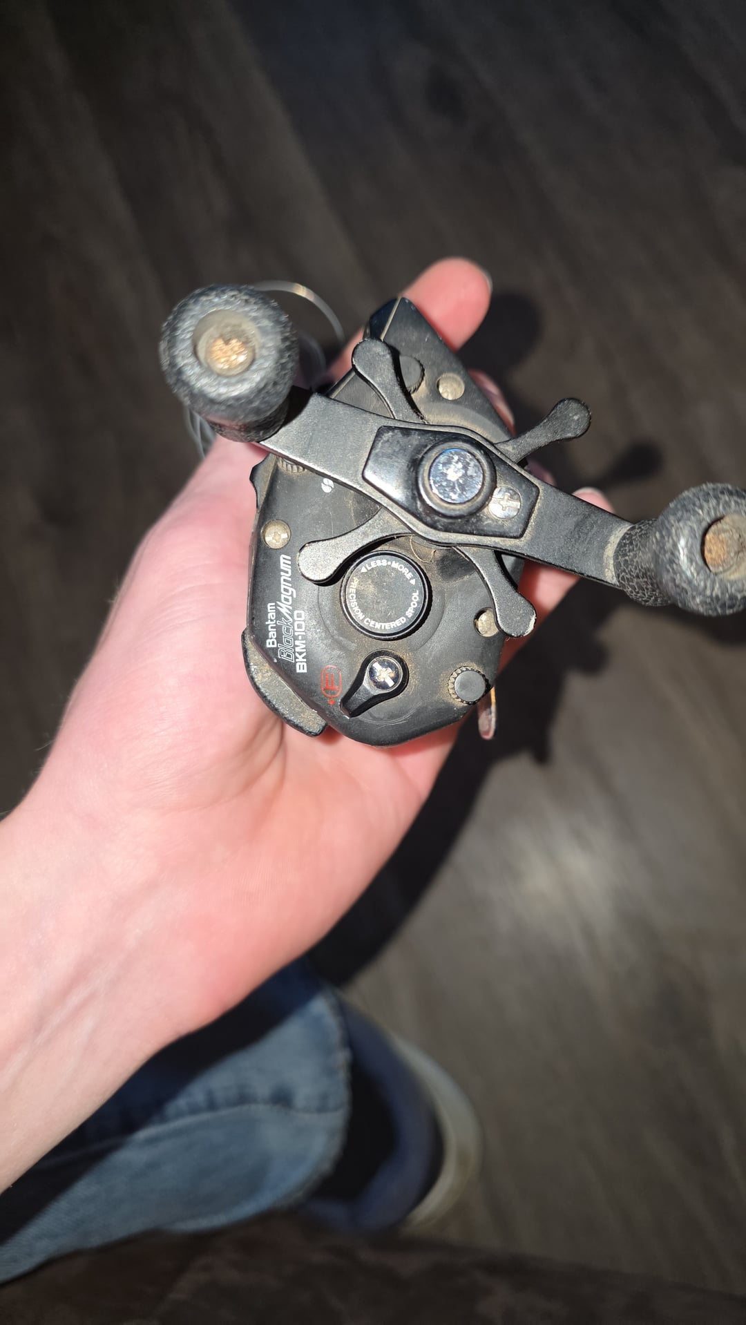 I got this bait caster from a ladies garage for helping her clean in. But I've only used open faced. Can someone explain the knobs? I know the big button is to cast and the small wheel is my drag. But it's used so the words are fading. There's a knob labeled ____ control with # 10-100. A switch with a big red F on it. A knob that reads "less-more precision centered spool"