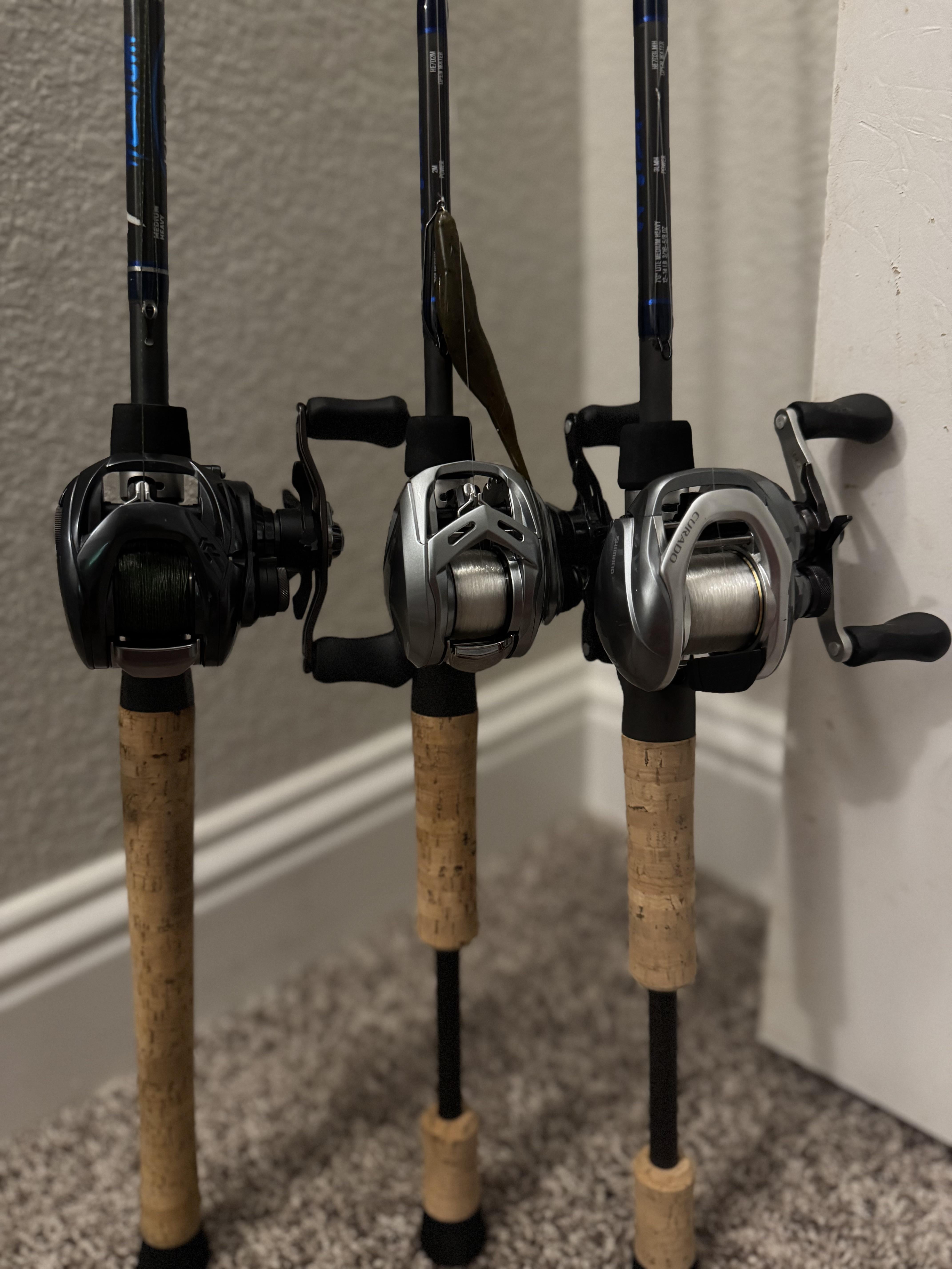 Left to right : Kistler Helium 7’3” MH Daiwa Tatula SV TW 40lb braid Kistler Helium 7’ M Daiwa Alphas SV TW 10lb fluoro Kistler Helium 7’ LMH Shimano Curado 12lb fluoro Posted by nrtzz