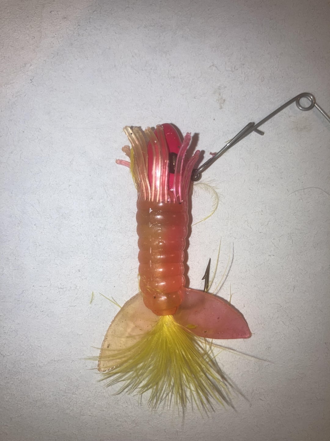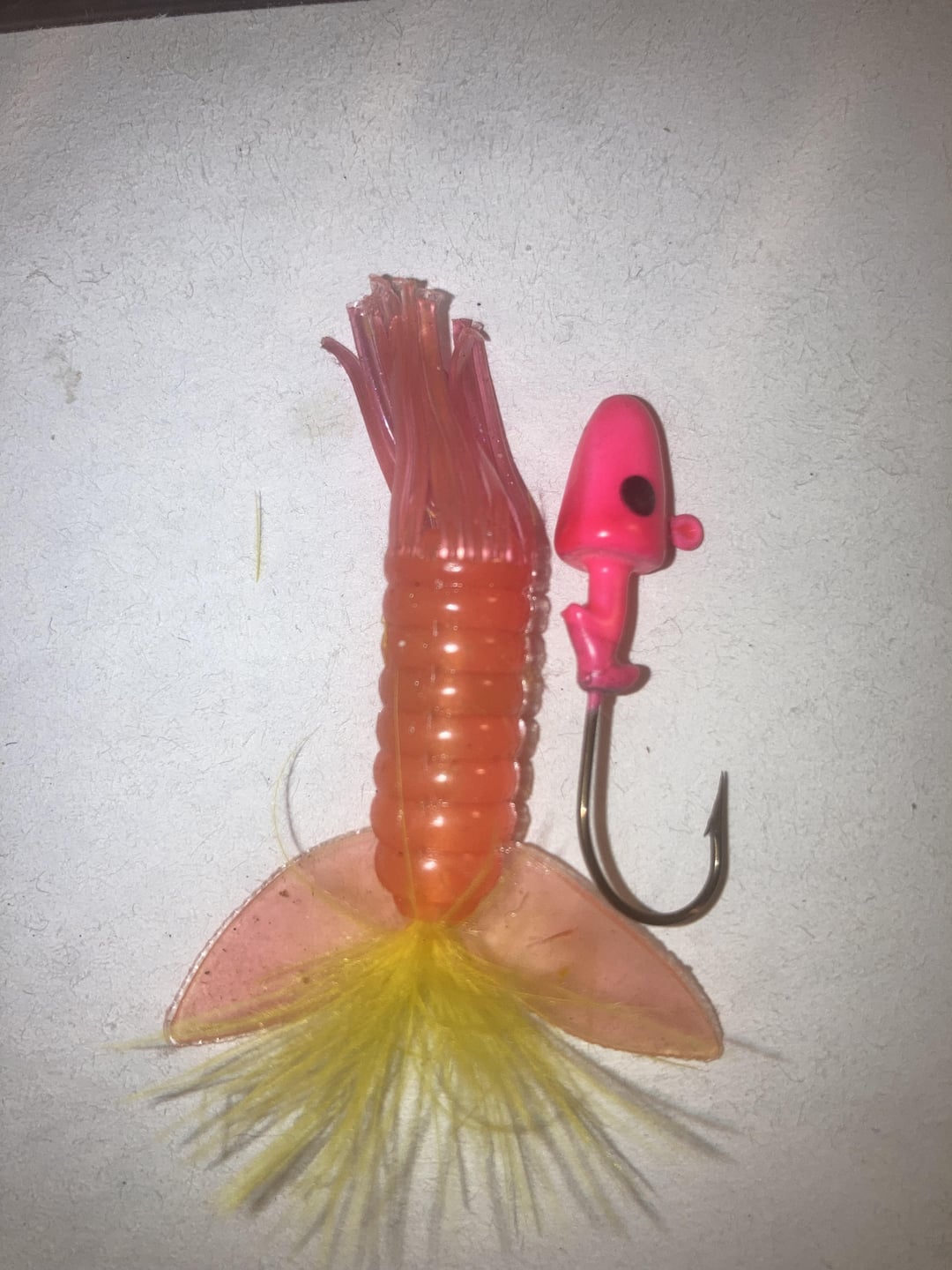 2. Foxee jig…at least 1/8 ounce I think, the 1/16 were all rubber body, no feathers