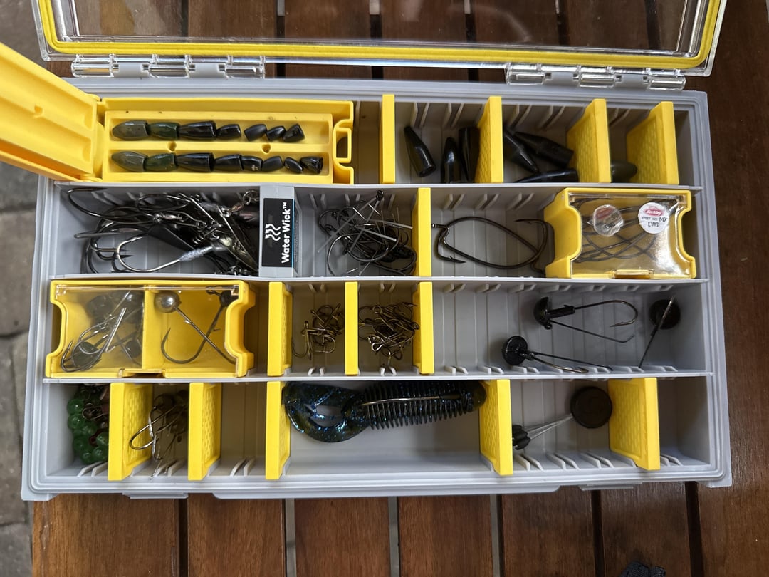 - Tungsten bullet weights (mostly Nako & Strike King), 1/16 oz to 1/2 oz (keeping 2-3 of each size)
