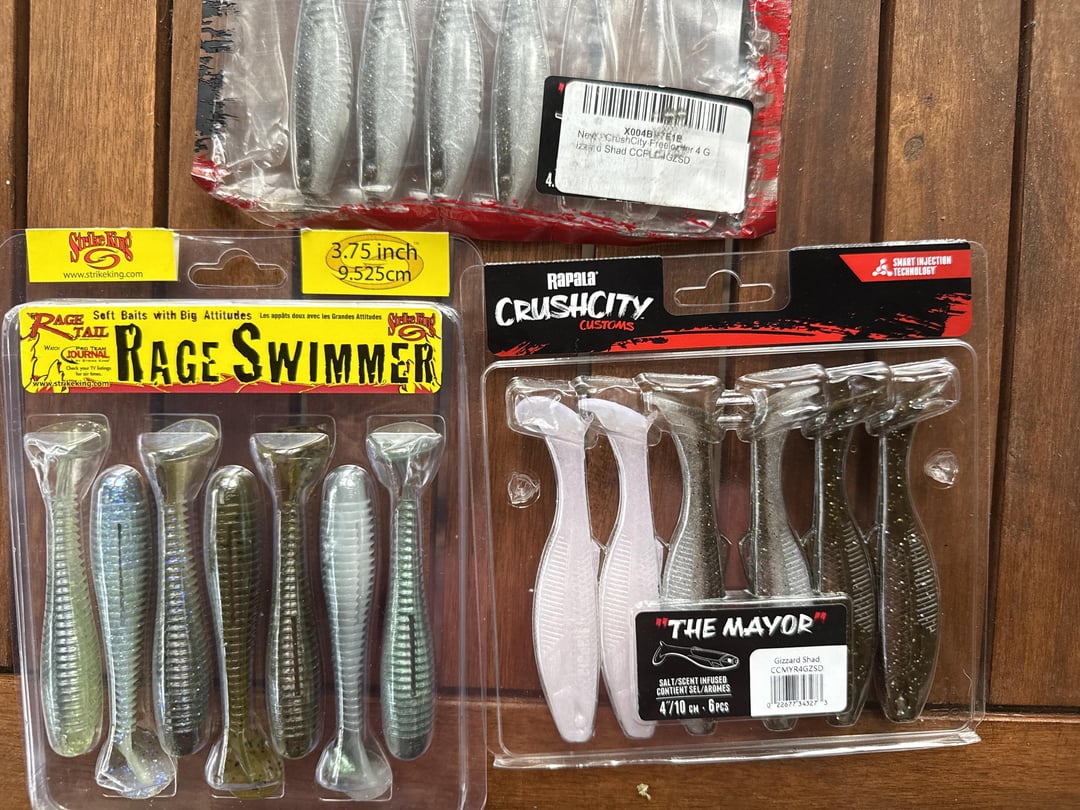- Strike King Rage Swimmers 3.75” – Green Gizzard, Sexy Shad, Electric Shad, Green Pumpkin