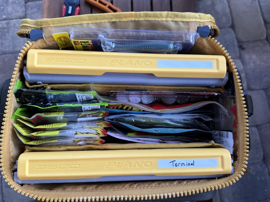 I've been bass fishing for about 18 months, mostly hitting smaller neighborhood ponds and lakes here in St. Cloud, FL. Over the last few week or two, I've been dialing in a dedicated pond kit to carry around easily, using a Plano Weekender bag with two Plano Edge 3600 boxes. Here's how I've got it set up right now—would really appreciate any advice on things I might be missing, or suggestions on what to trim or swap out for more efficient pond fishing: