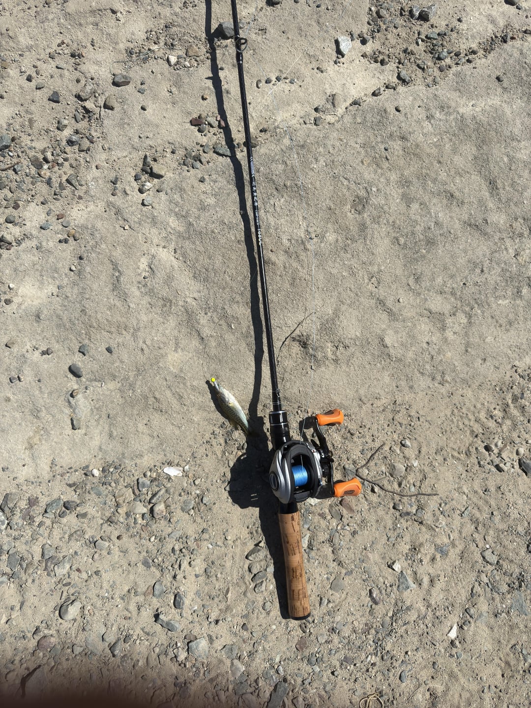 Abu garcia max stx with dc module, 6lb braid to 4lb mono 1/32 oz jighead with a 1 inch gulp minnow(it performed honestly better than I thought but 4/10 don’t recommend just use a spinning reel). I think fella was around 5 inches didn’t have a measuring tape on me though 🙁