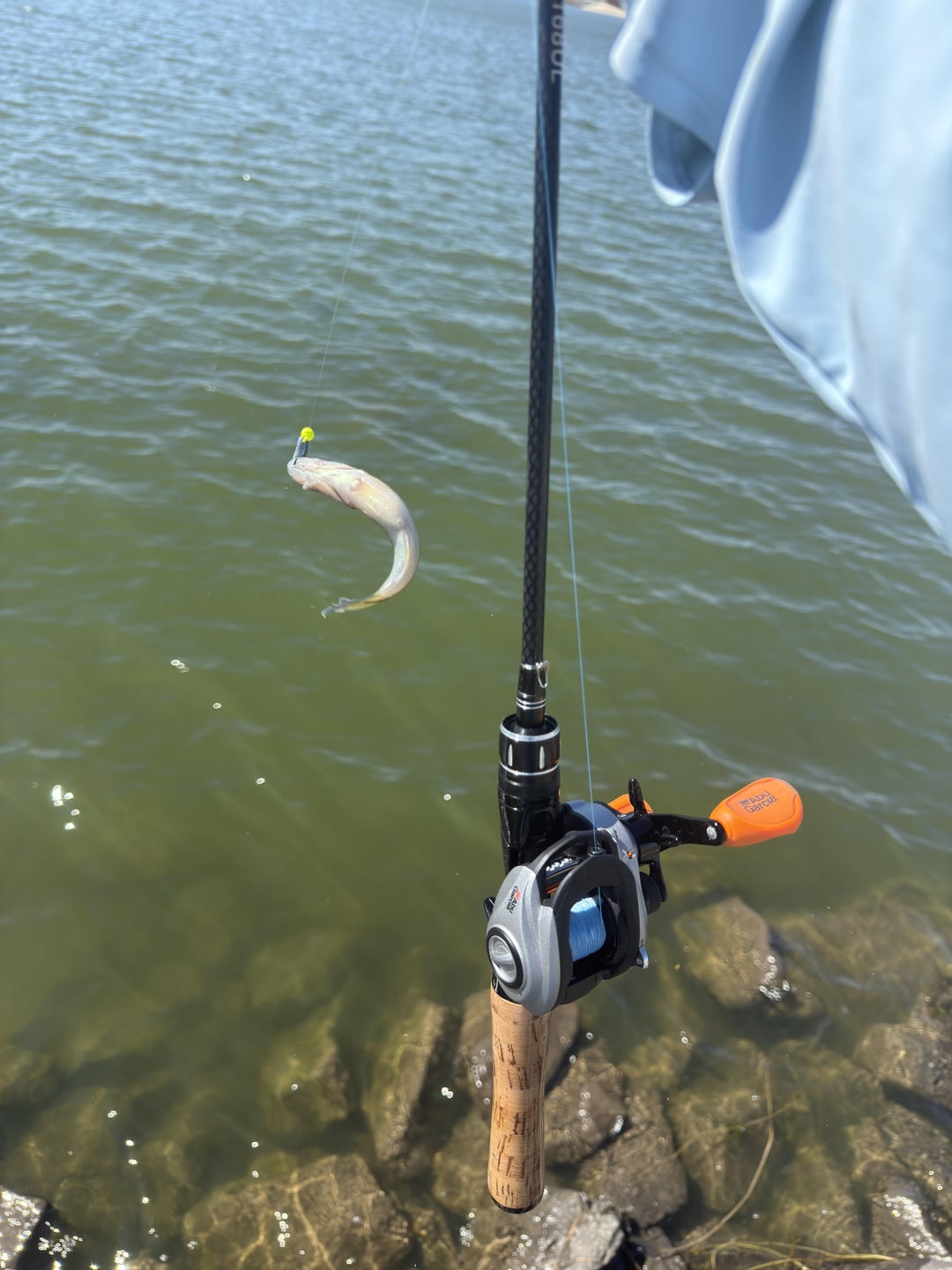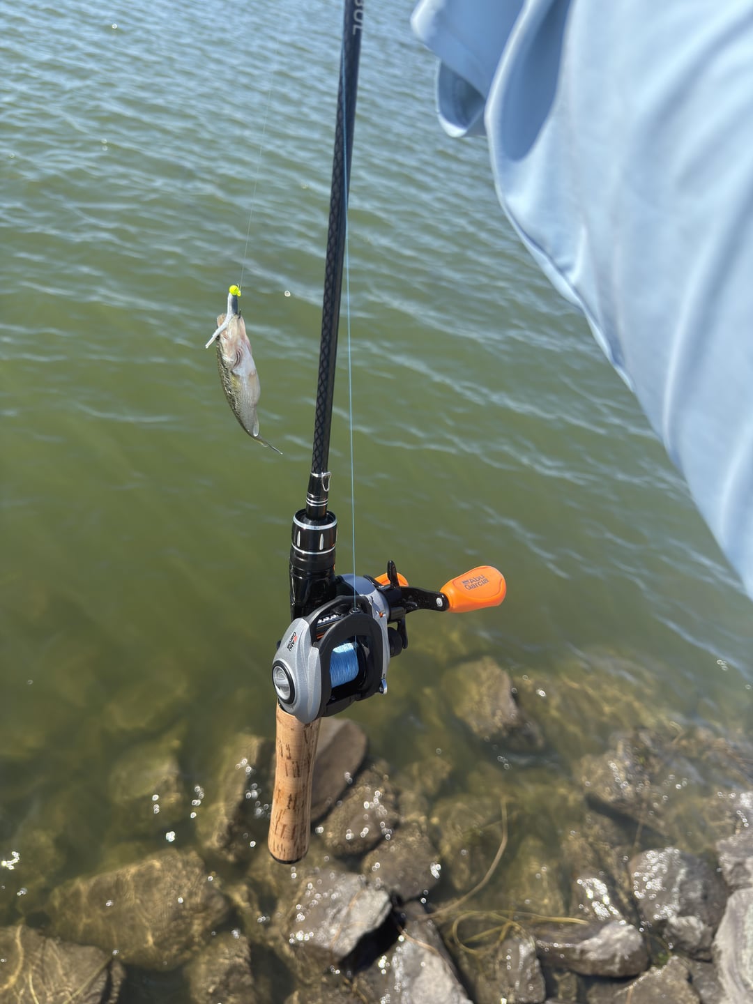 Abu garcia max stx with dc module, 6lb braid to 4lb mono 1/32 oz jighead with a 1 inch gulp minnow(it performed honestly better than I thought but 4/10 don’t recommend just use a spinning reel). I think fella was around 5 inches