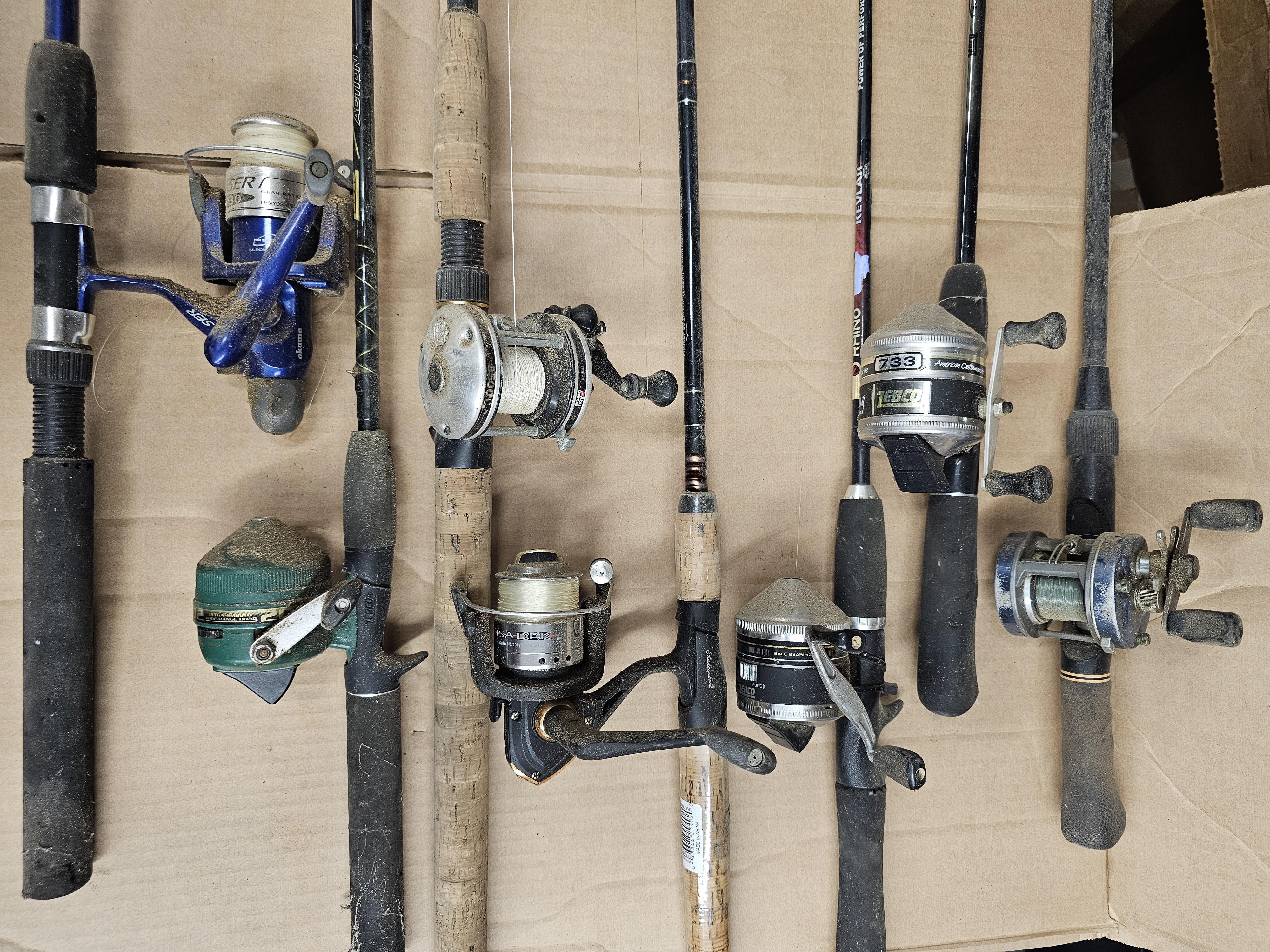 From left to right: Okuma Chaser AX-30, Zebco 202, Abu Garcia Ambassadeur 5500c, Shakespeare Crusader CRUS35, Zebco 33, Zebco 733, and Daiwa Millionaire.