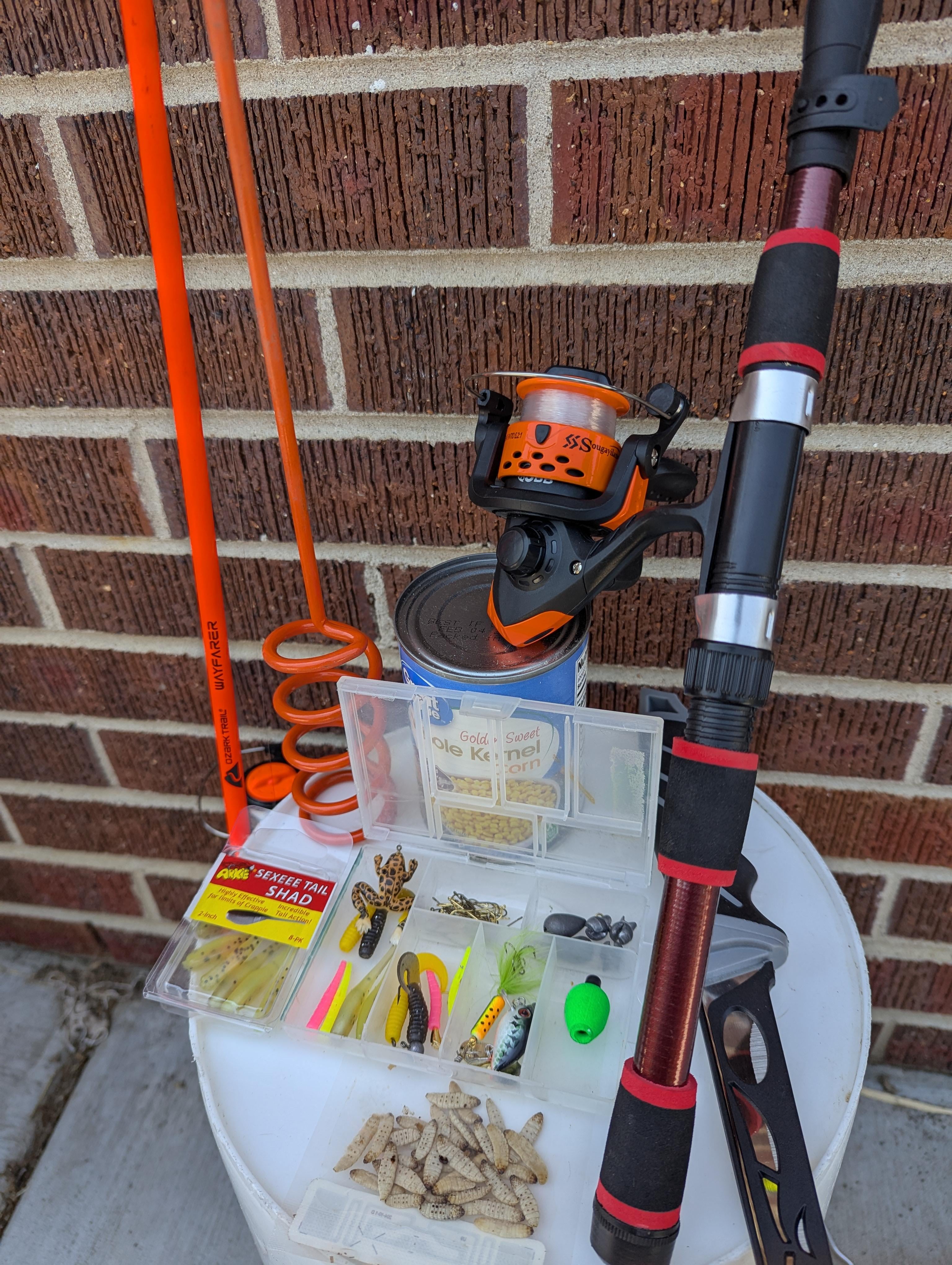 I don't have access to my fishing gear at the moment. I had to scramble to put together a serviceable bit of gear, bait, and tackle as cheap as possible. This is what I came up with. Minus some line, EWG hooks, and extra grubs that I have in a cabinet.