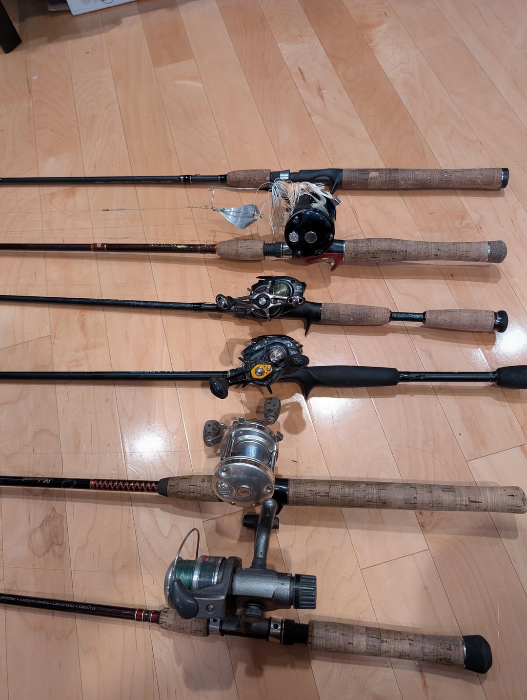 Over the past 4 years or so I've assembled a bit of a hodgepodge of rods and reels. Mostly through fb marketplace. I just got a kayak and so I'd like to set these up so that each combo has a purpose. So I spend less time retying lures. I'll be freshwater fishing in Minnesota, mostly targeting bass. Does anyone have any suggestions for how I should pair these rods and reels, and then how I should set them up?