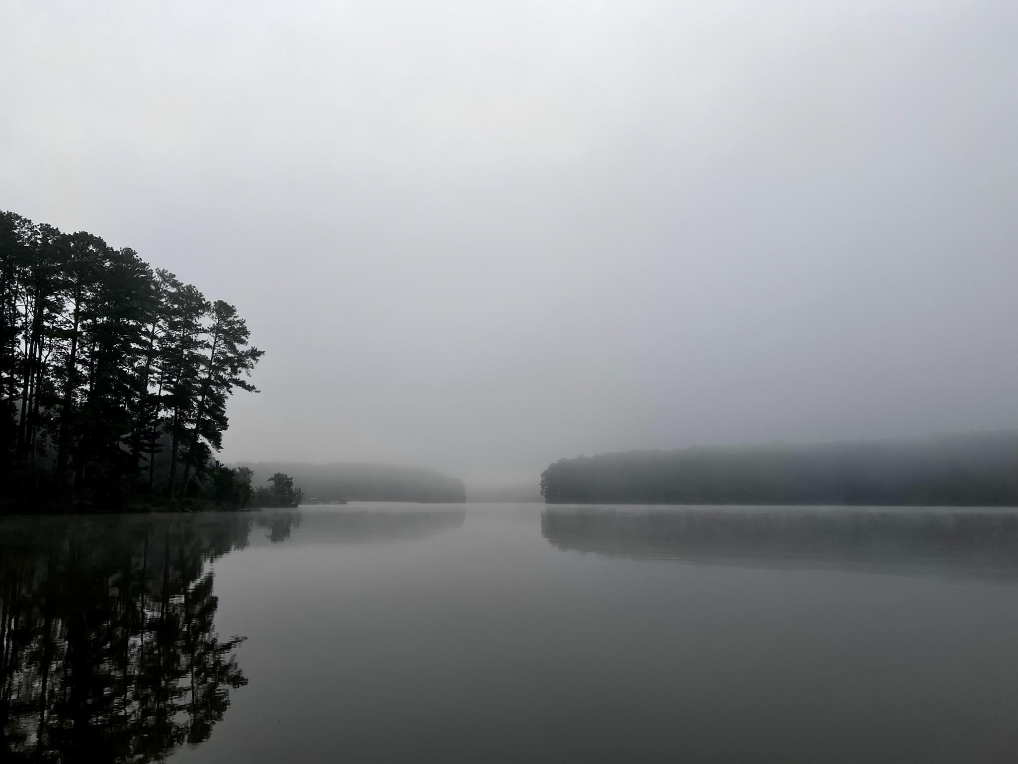 I went out on the lake this weekend and was the first one out. Right as the sun was coming up (7AM), there was a dense fog. I snapped a photo which hardly does the amount of fog justice. The image looks monochrome but is actually unaltered!