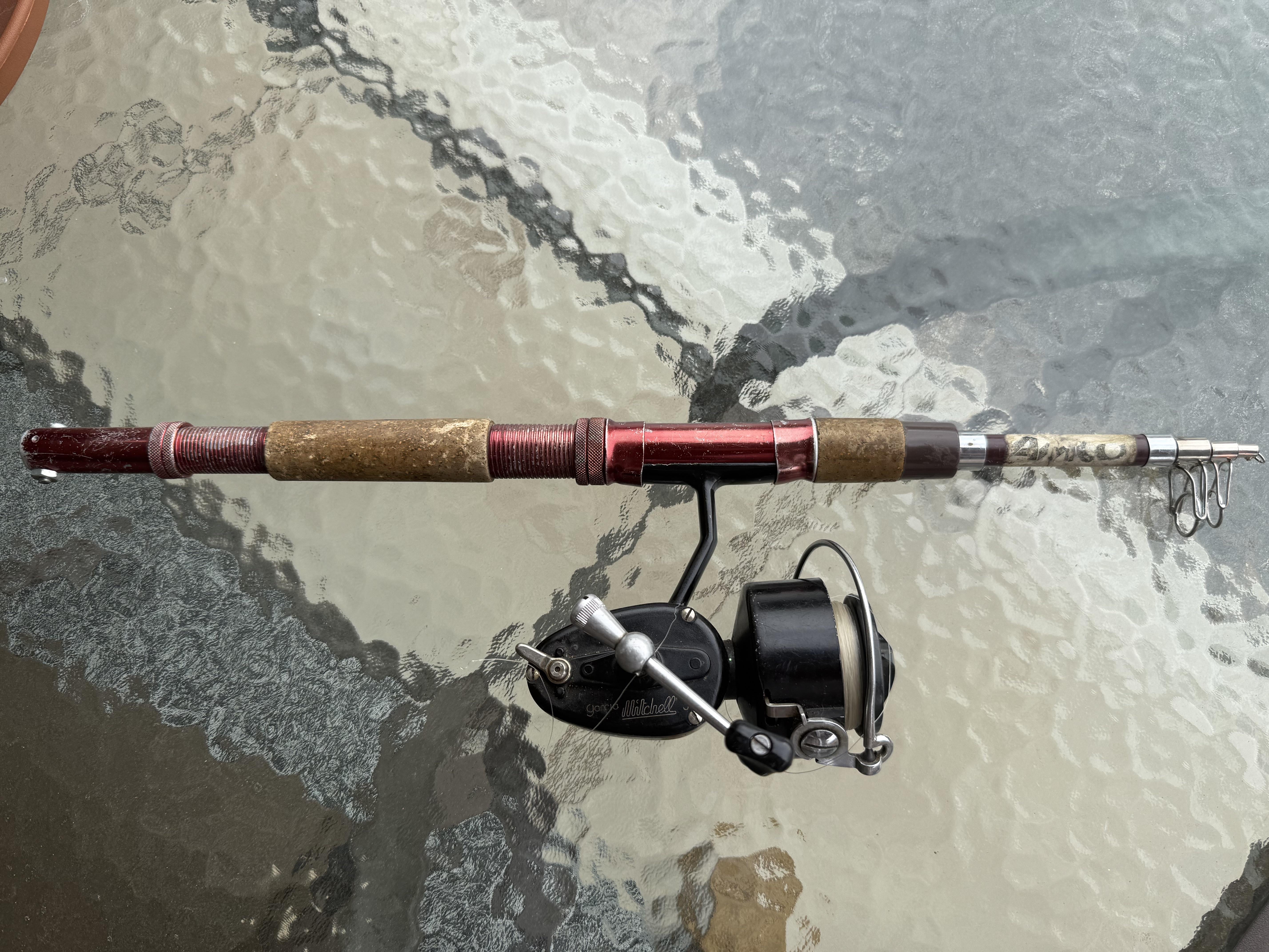 My late father was a long time fisherman and very rarely let us kids use his gear. He passed sometime ago, and as I have become a mediocre fisher, I finally decided to take a look at his rigs. This is clearly a left-handed Garcia Mitchell 301, still in good shape — even though he was right handed, and so am I, we I fish lefthanded and reel with the right. A family quirk!
