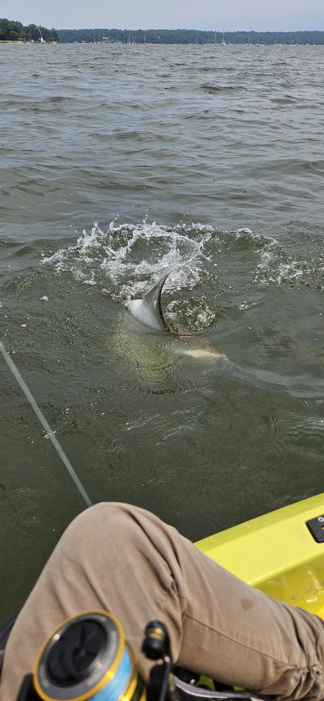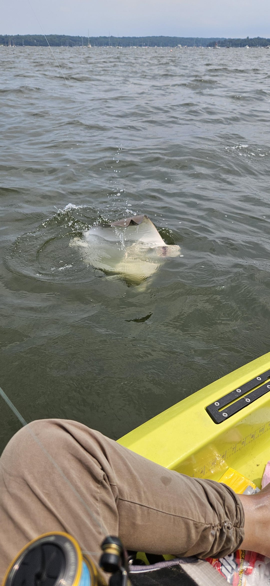Thought I caught the bottom plug again when the line started running, but hey it's a fish. There are stripper and fluke and weakfish around here, I thought could be one of them. Set the drag loose and took almost half hr for me to bring it close to the kayak.