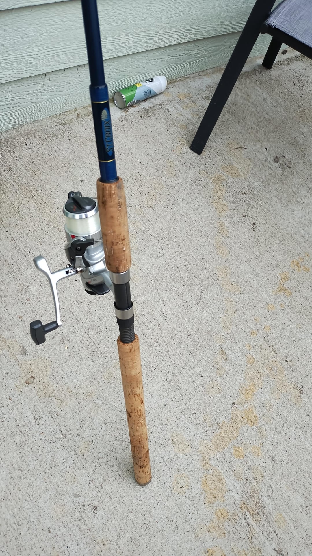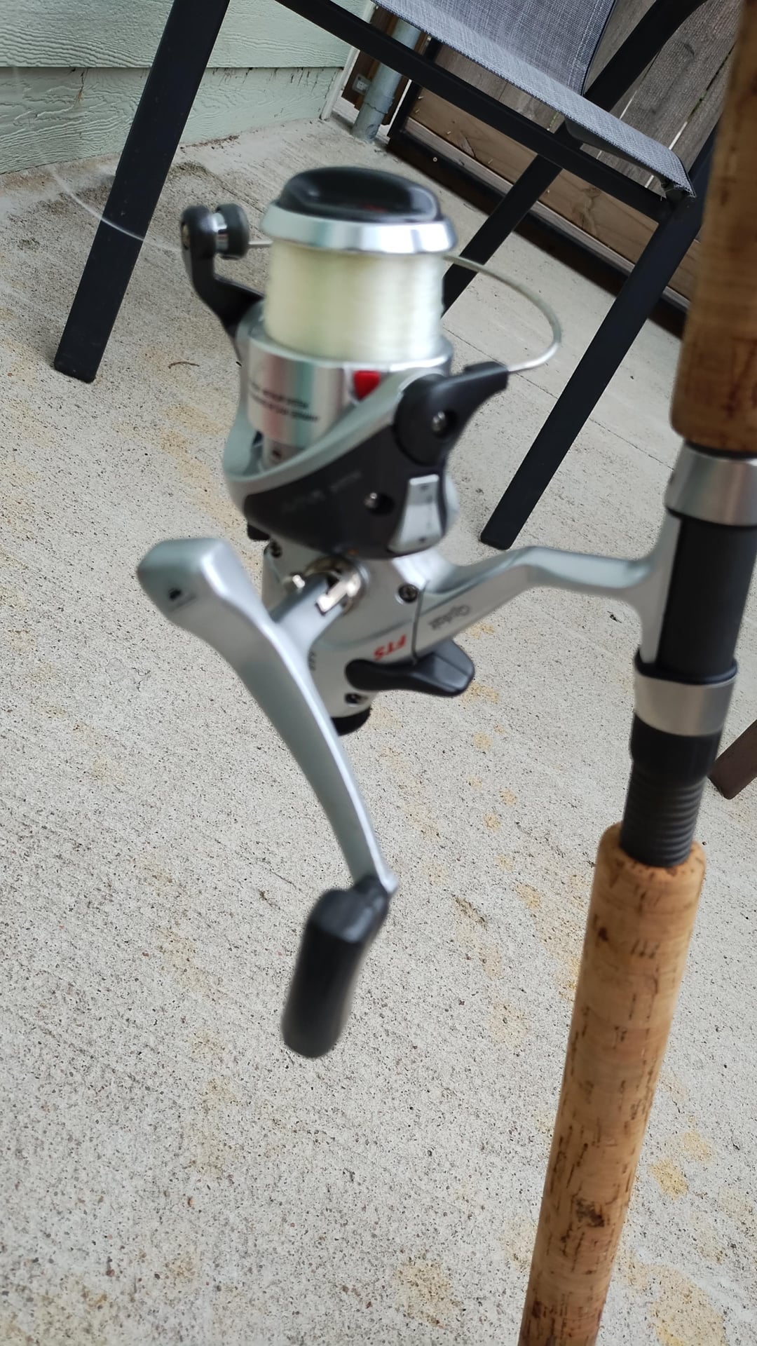 Here's one I'll bet few of you have seen. Quick bait runner 645 FS, circa year 2000. Just spooled it with new 17lb test. Mounted on St Croix Classic Cat 7.5ft fiberglass telescopic rod, also about 25 years old.
