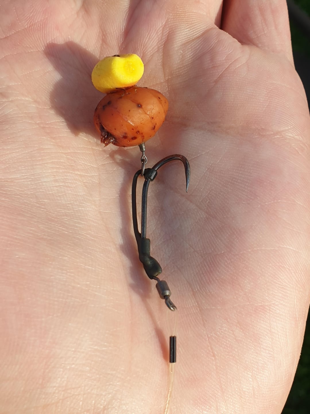 Lead was ejected on the take, carp surfaced almost right away and didn't give much of a fight. I noticed the injury before netting it, had a solid hookset dead center of the bottom lip. Rig I was using is in the pics, spinner with a barbless longshank on a 20 lb fluoro hooklink.