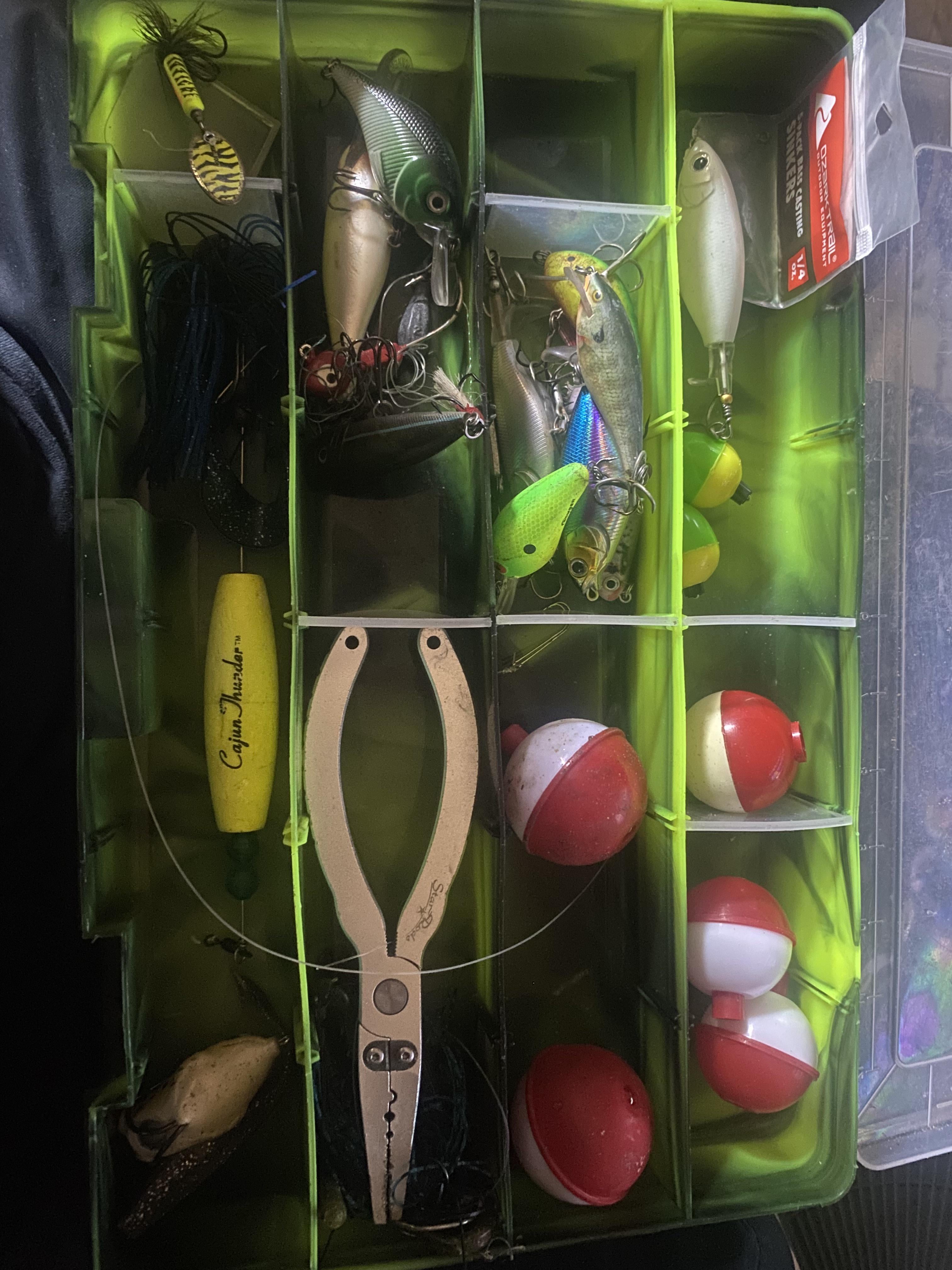 Yes good deal. Top left is a rooster tail and below it is a blue/black spinner or bitsy bug. (I’d start with that). Top right is a plopper of some kind. These are so fun once you figure out when/where to use them. I also see a frog in there. Watch some vids on how to fish one. Those pliers are nice too.