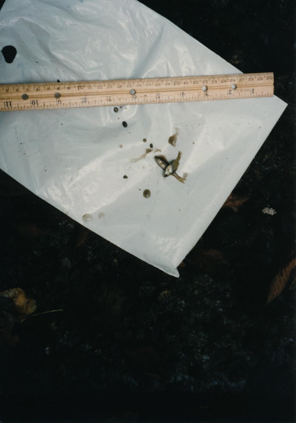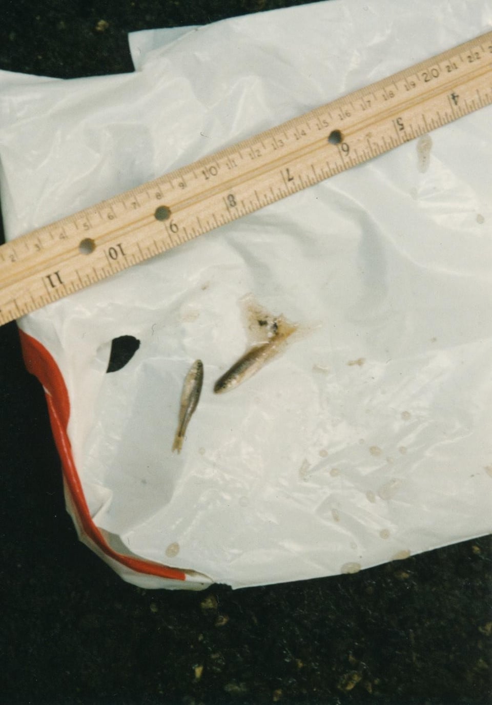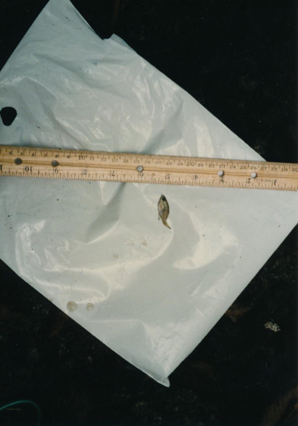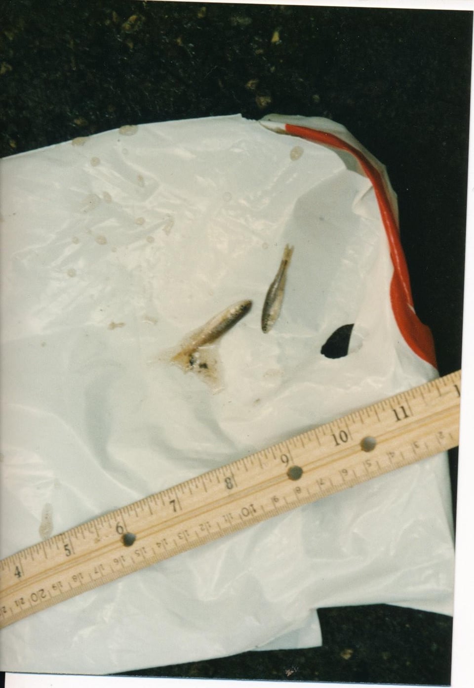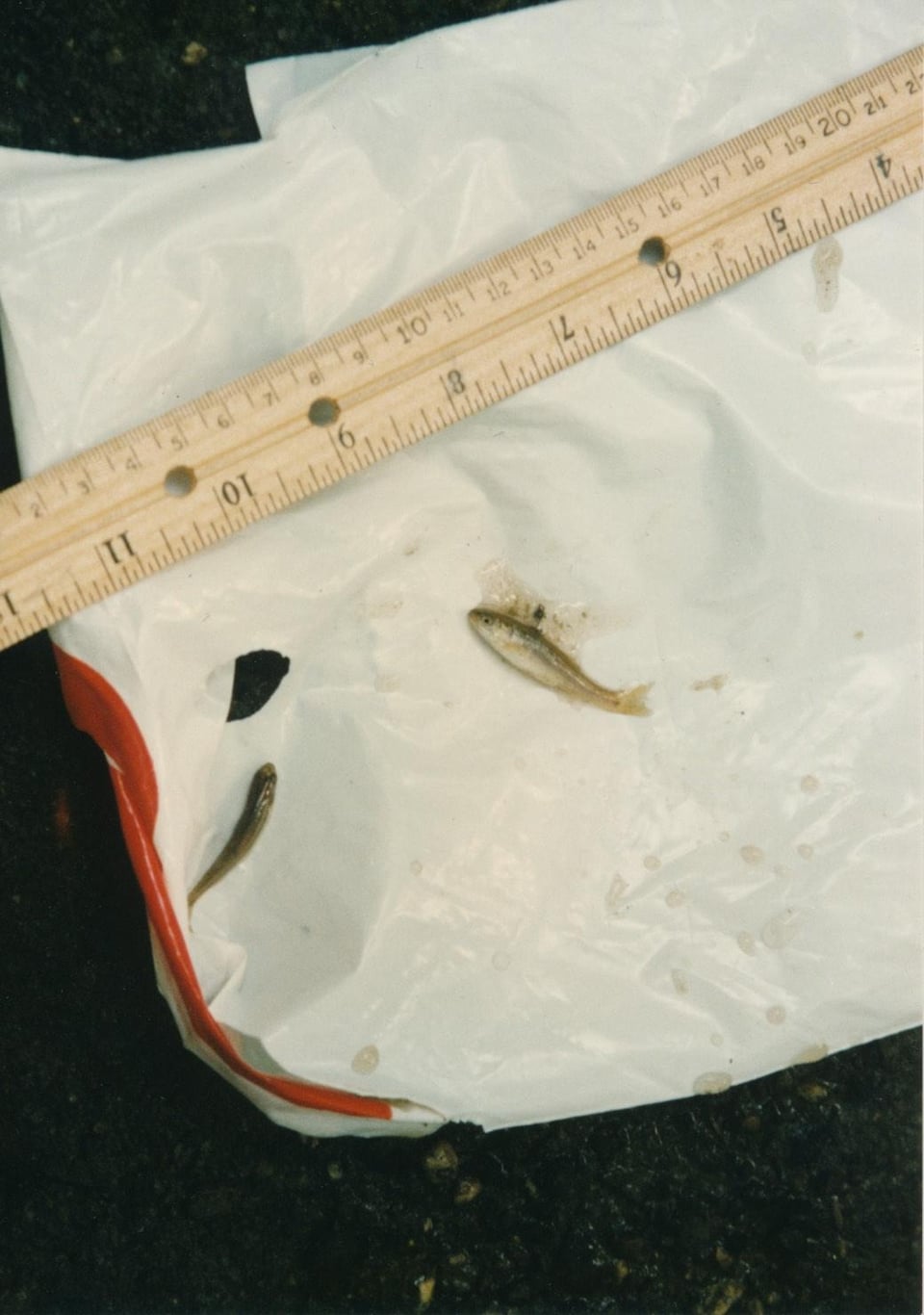 These fish were caught by me in a small stream some 29 years ago and I recently rediscovered the prints. They were taken with a film camera way back in 1996 so the quality is not great. A ruler is shown for the relative sizes in inches or centimeters. I always wondered what they were. I am guessing creek chubs and bluegill?