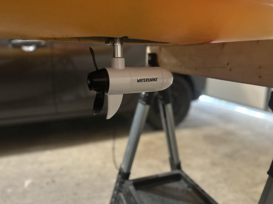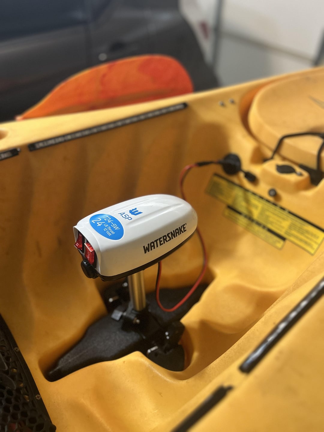 2014 Hobie Outback, 24lb Thrust Watersnake “Asp”. Modified it to go in the cassette plug & shortened it, also modified a SAE plug so the wiring can go in the hull with the battery 12v Lithium Iron 35 Amp hrs.